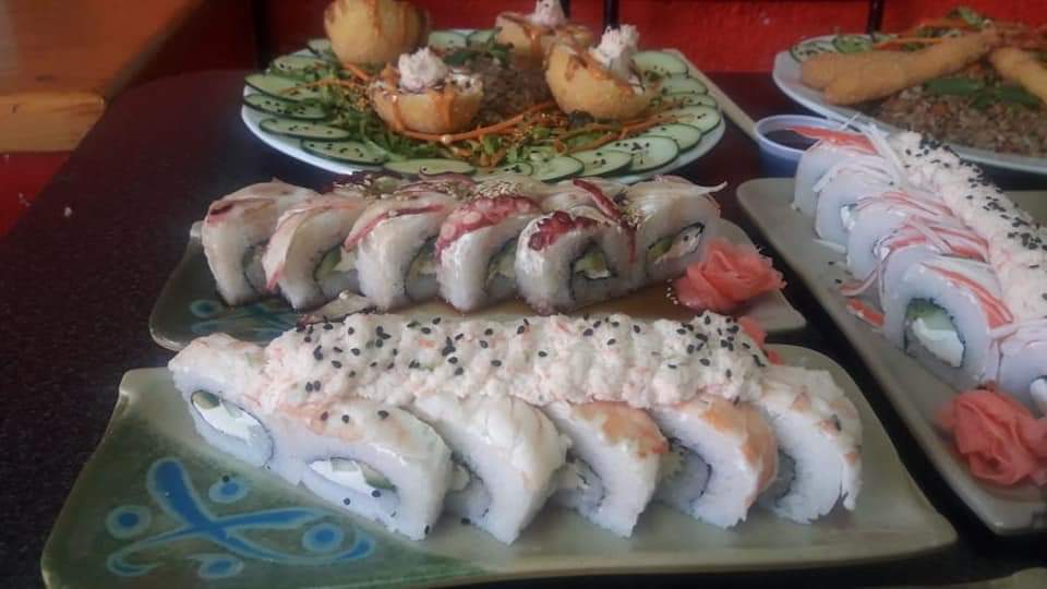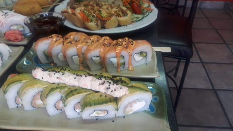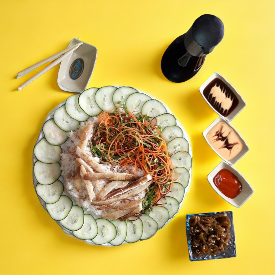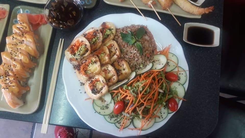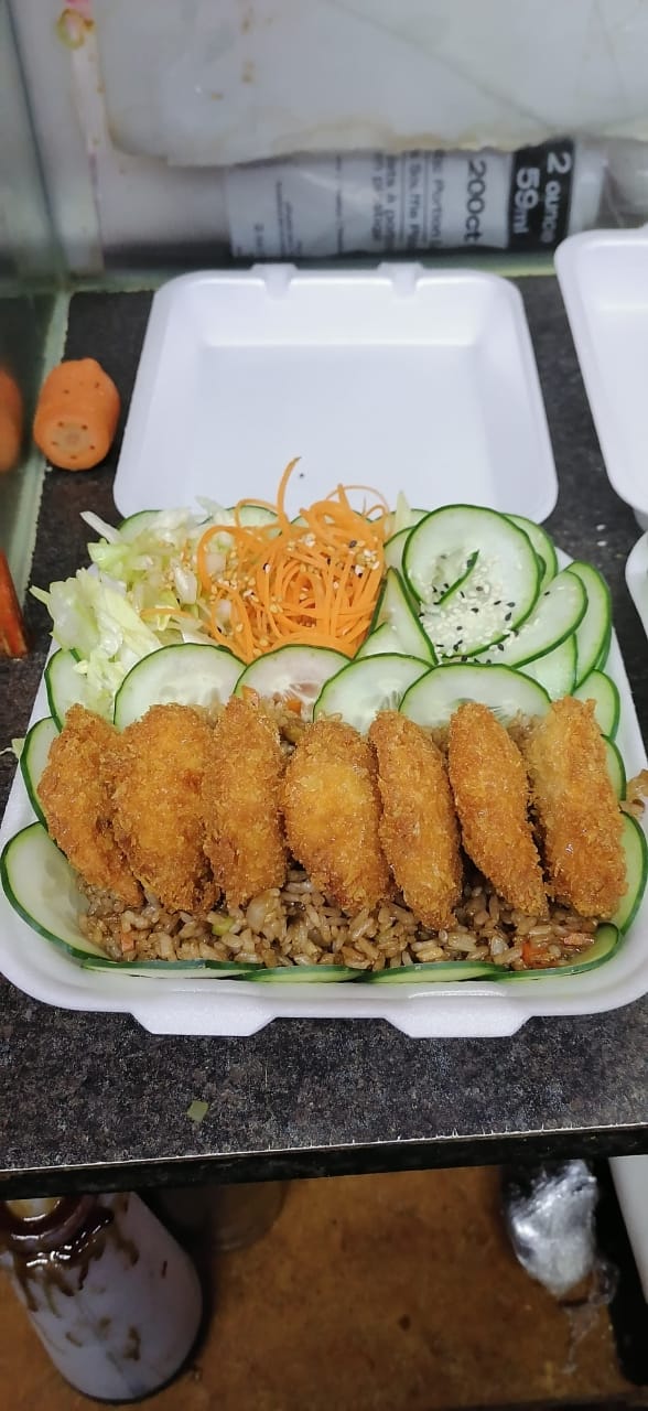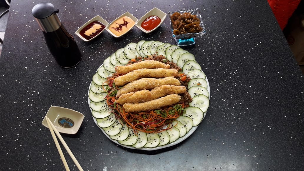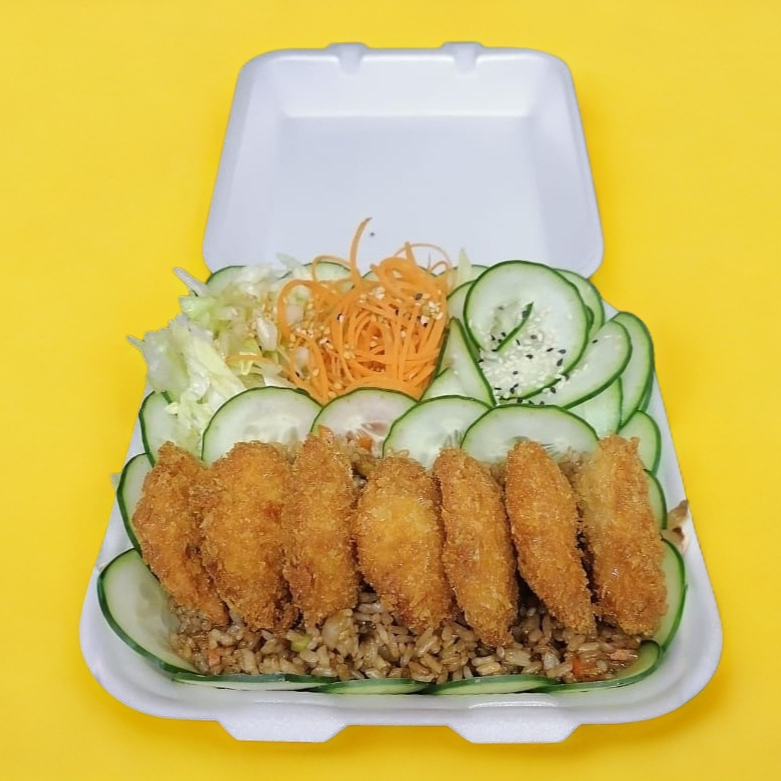 Cubierto con pollo empanizado, por dentro queso manchego, aguacate, pepino y aguacate encima, salsa chipotle o tampico ,acompañado con arroz yakimeshi y ensalada.