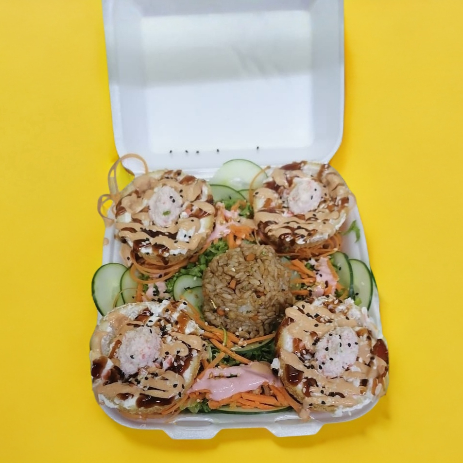 Incluye 2 piezas (porción para 4).Bolitas de queso Philadelphia rellenas de camarón y surimi, empanizadas y bañadas en salsa dulce de tampico y chipotle; acompañadas con ensalada.