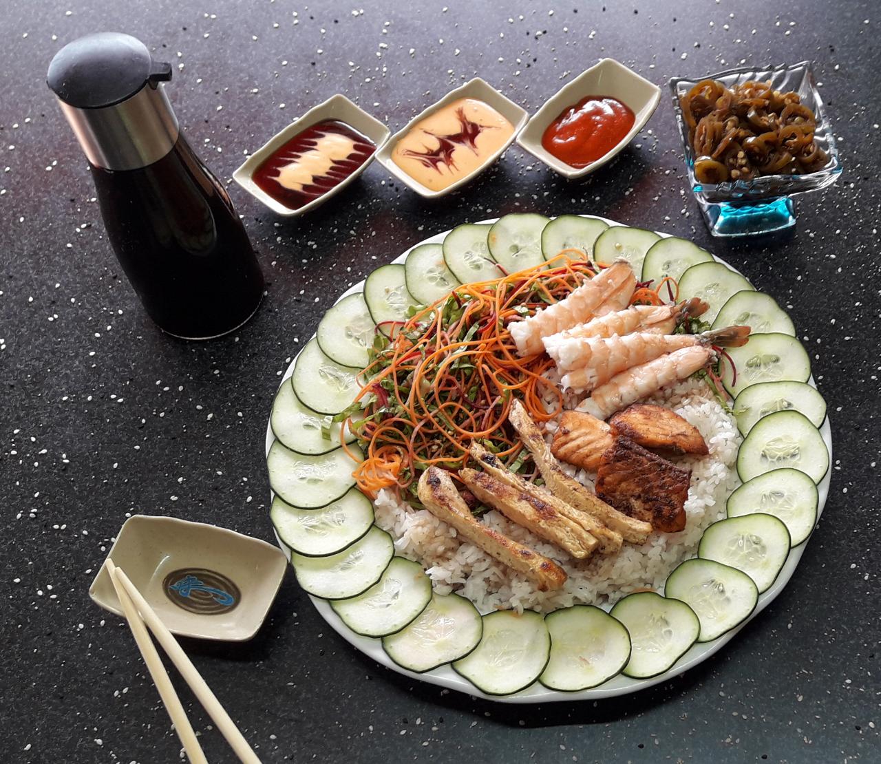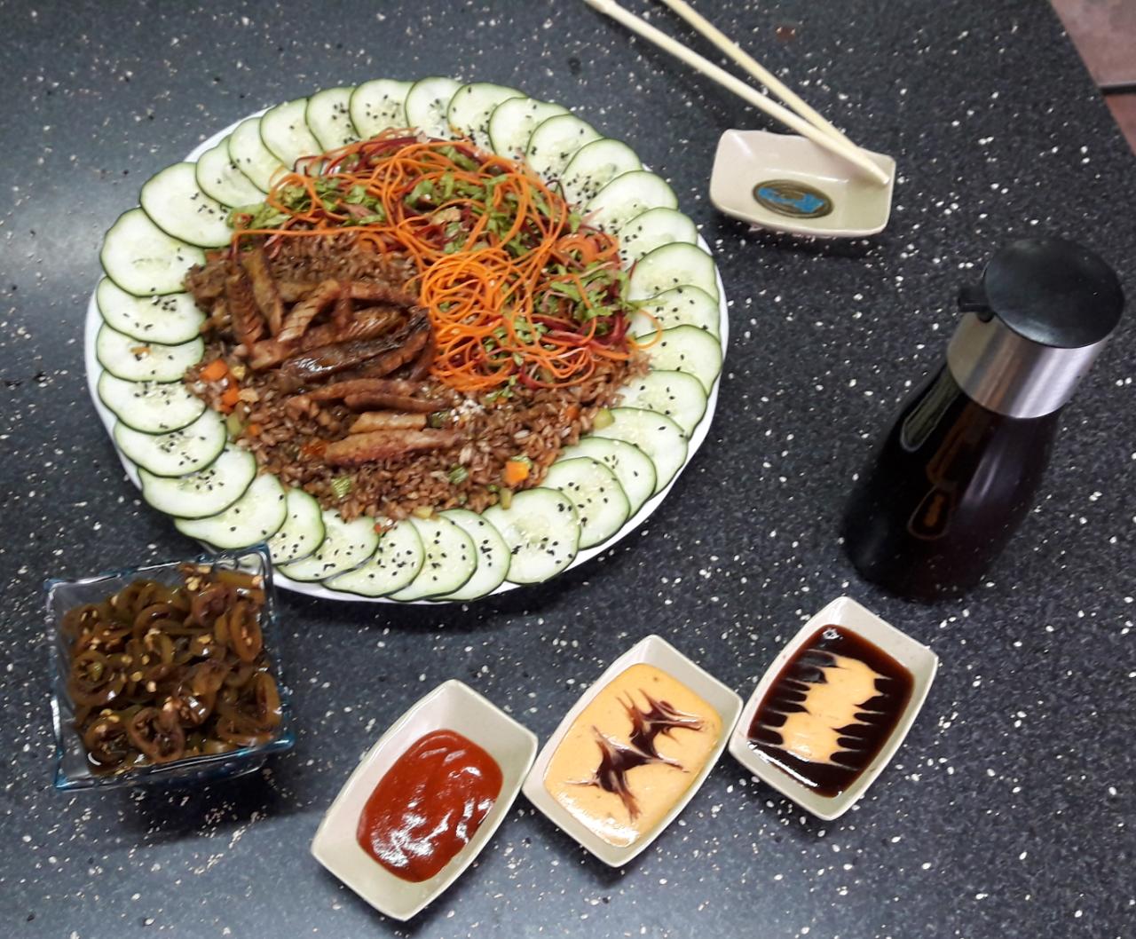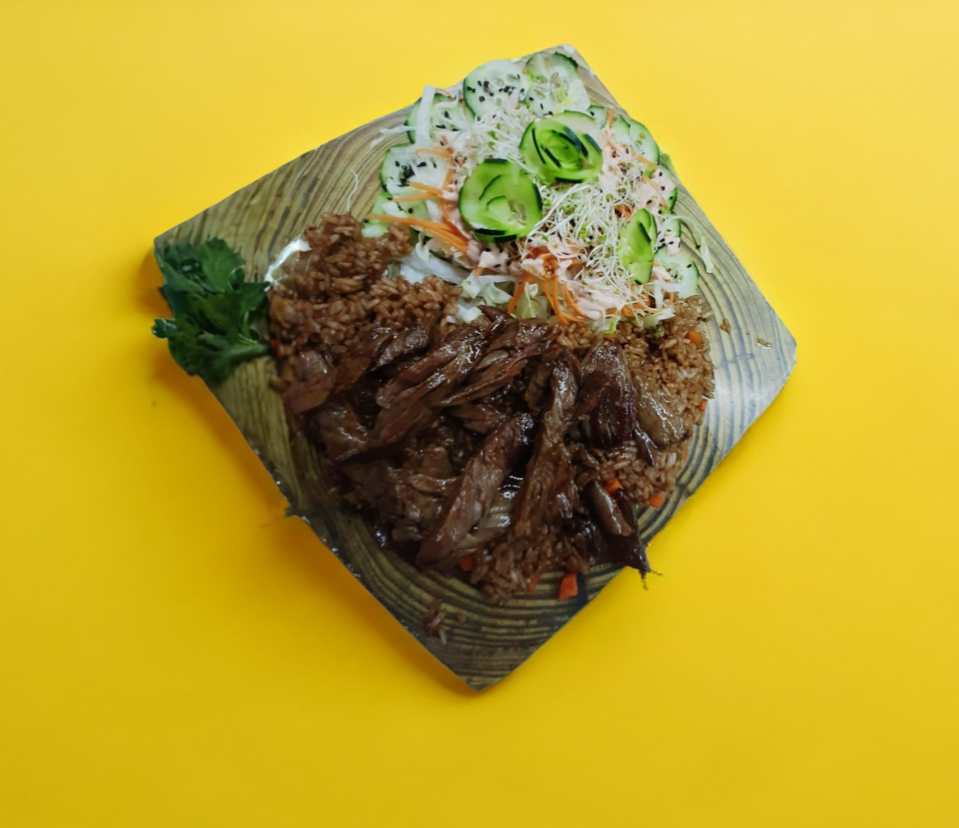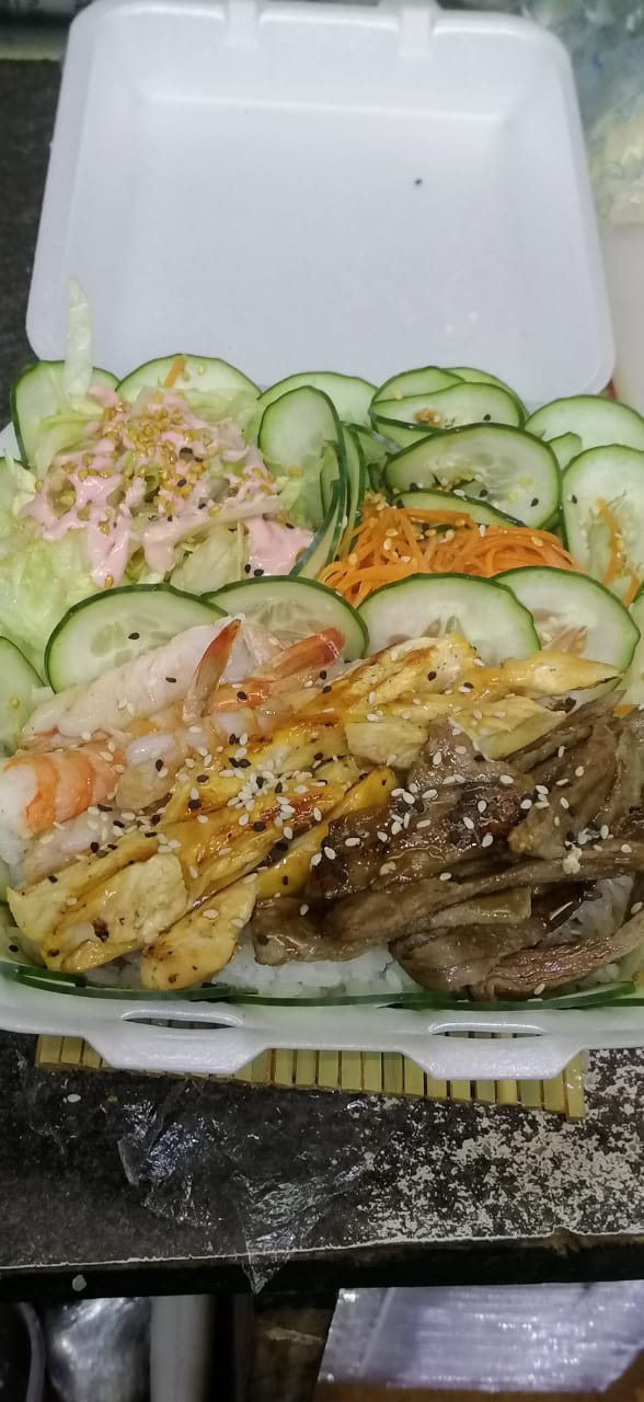 Carne asada, aderezada con salsa agridulce, arroz al vapor y ensalada (pollo, res y camarón).