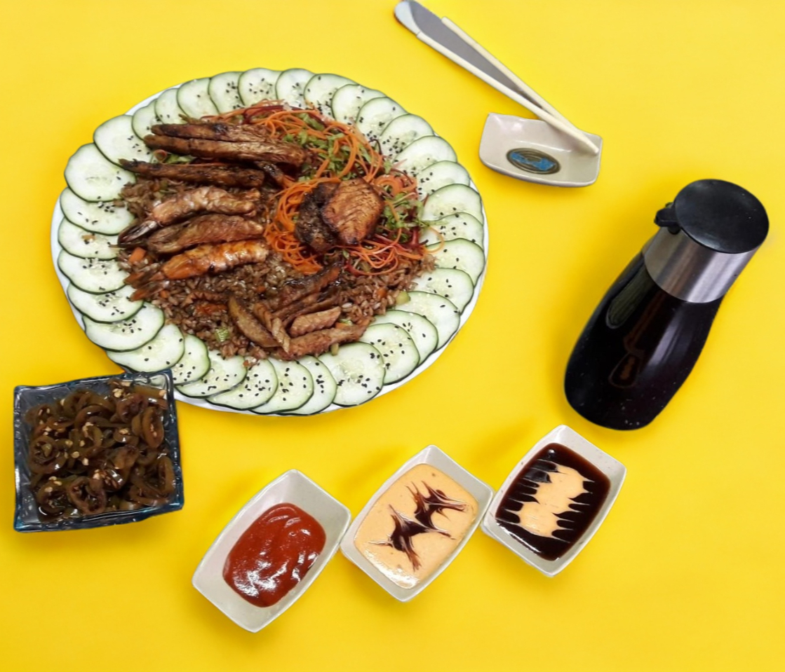 Arroz frito con soya y especies (pollo, res y camarón).