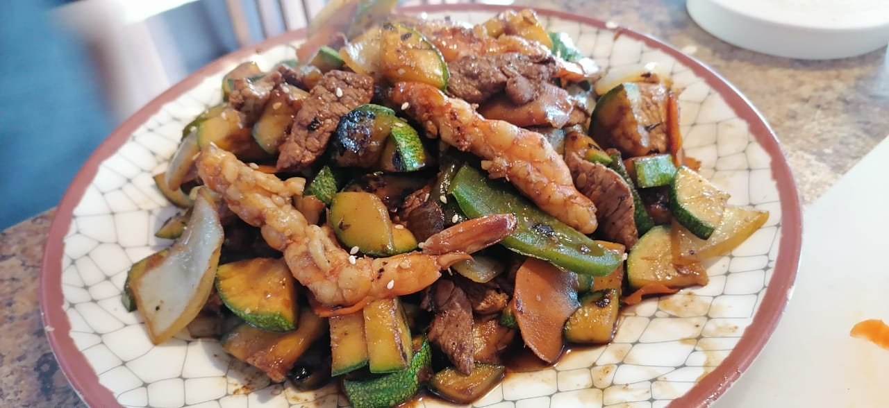Carne y verduras asadas aderezadas con salsa de soya (pollo, res y camarón).