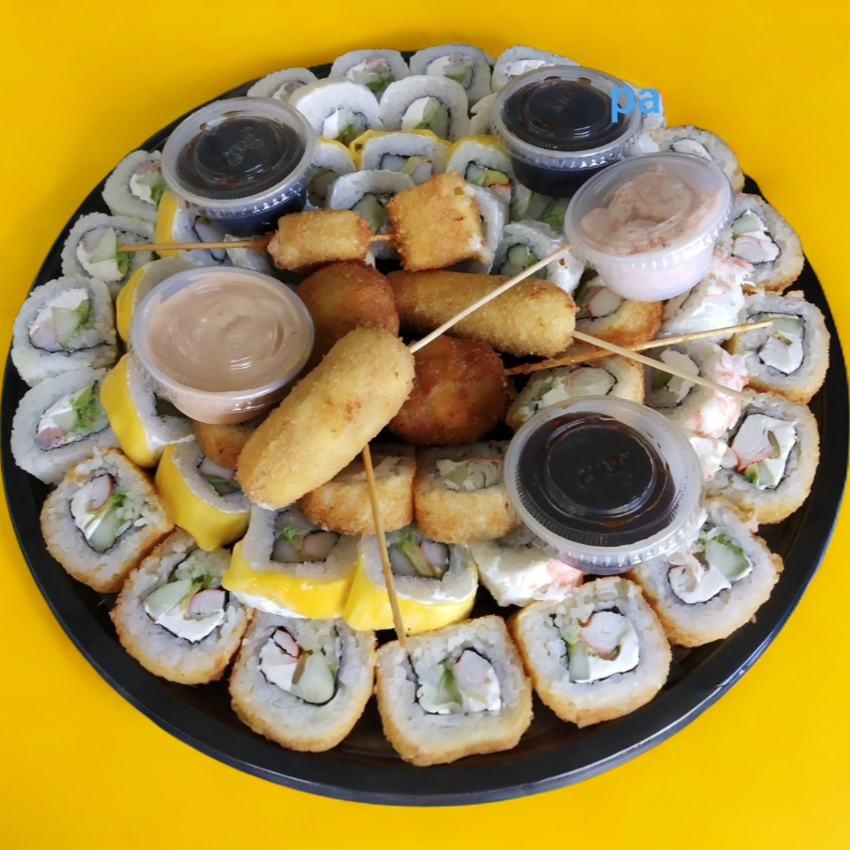 Toricatsup*1 + Canicas Rellenas De Mariscos*1 + Yakimeshi con Pollo*2 + Kushiagues Mixtos*1 + Refresco familiar*1