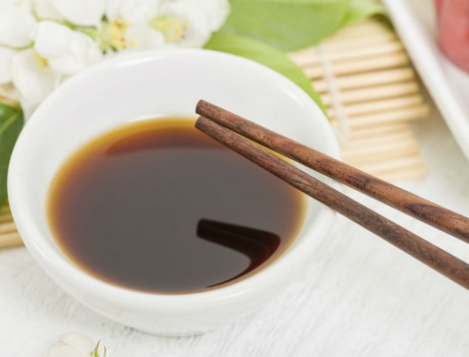 Carne y verduras asadas aderezadas con salsa de soya.