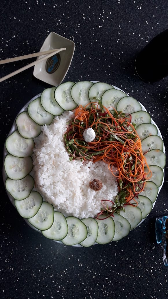 Ensalada de pepino con fideo de arroz y vinagreta de la casa.