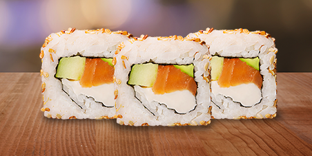 Por fuera arroz y ajonjolí, por dentro salmón y queso queso.