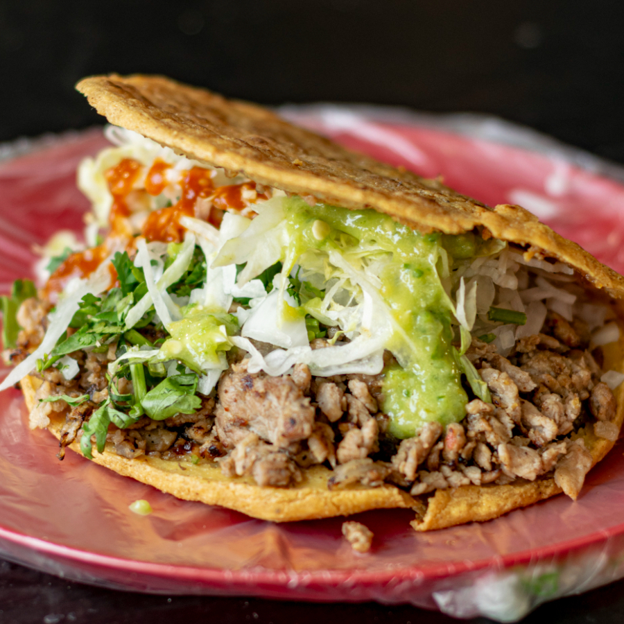 Gordita frita de chicharrón rellena con carne al gusto.