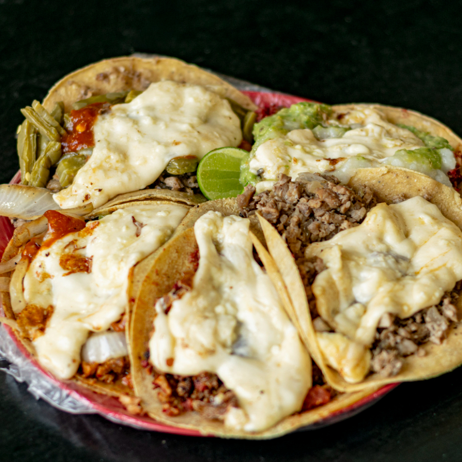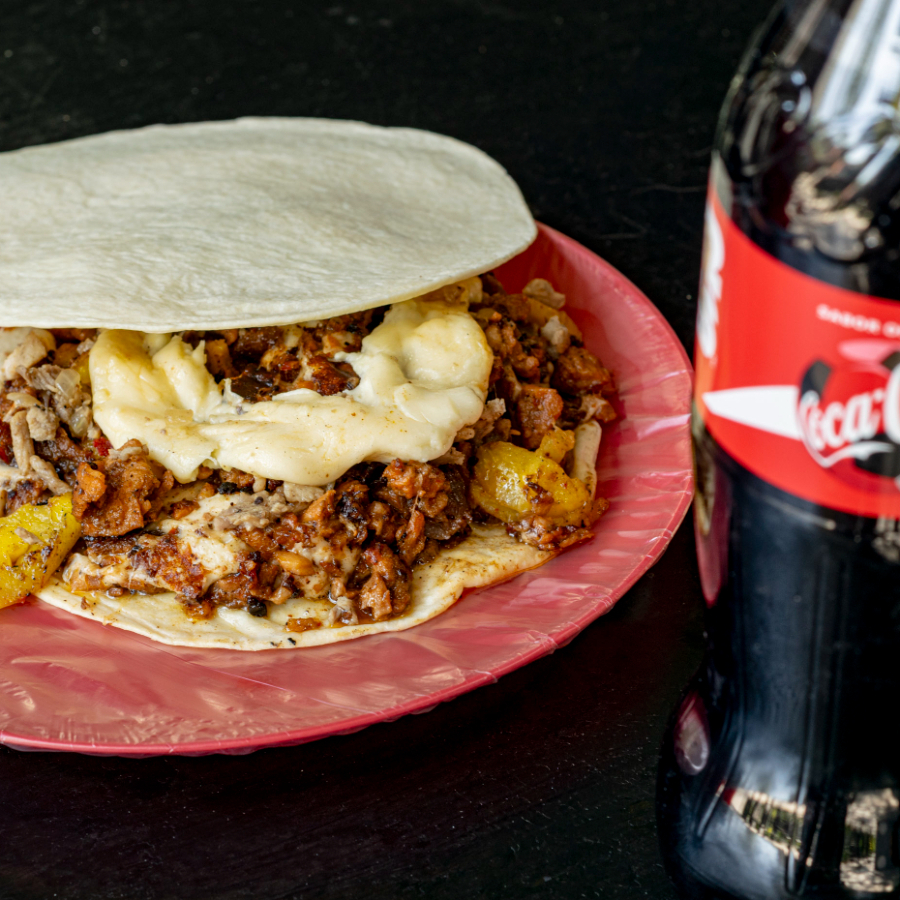 Taco en tortilla de maíz con queso oaxaca y complementos a elegir.