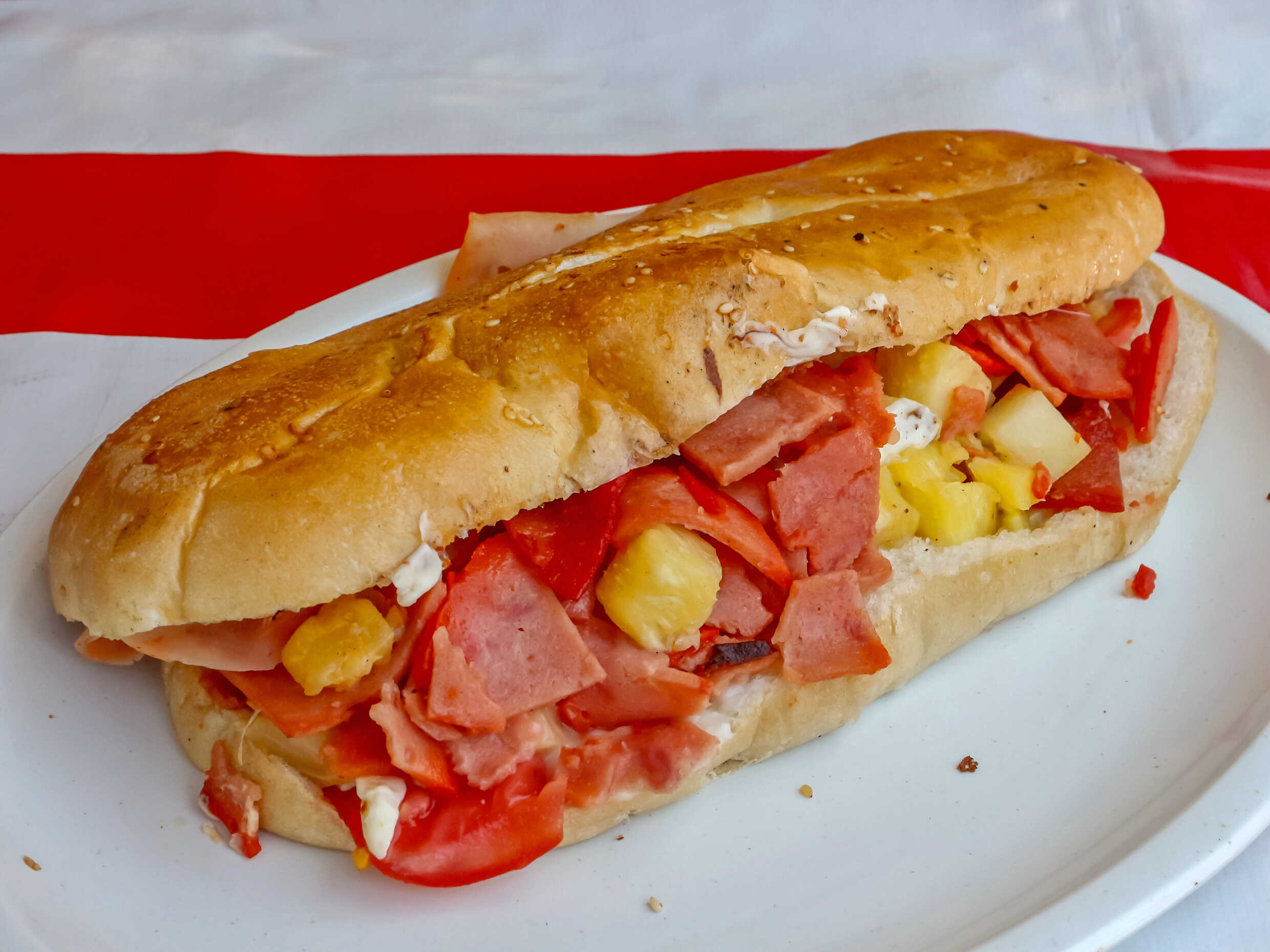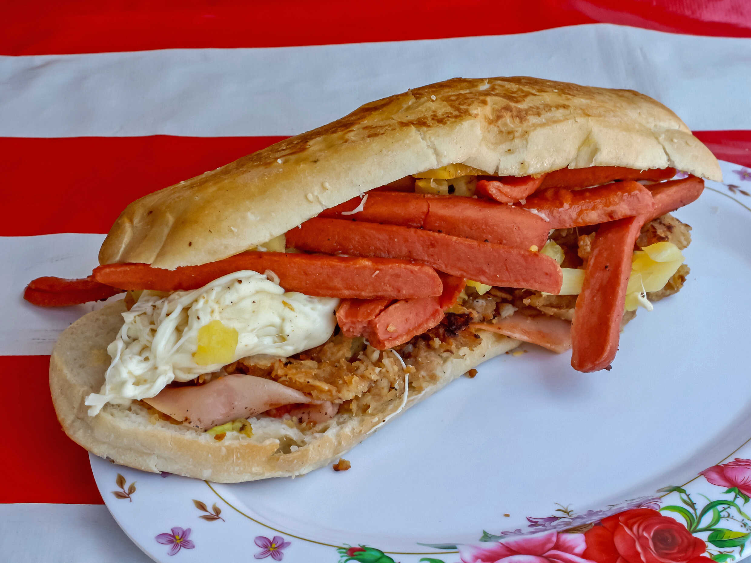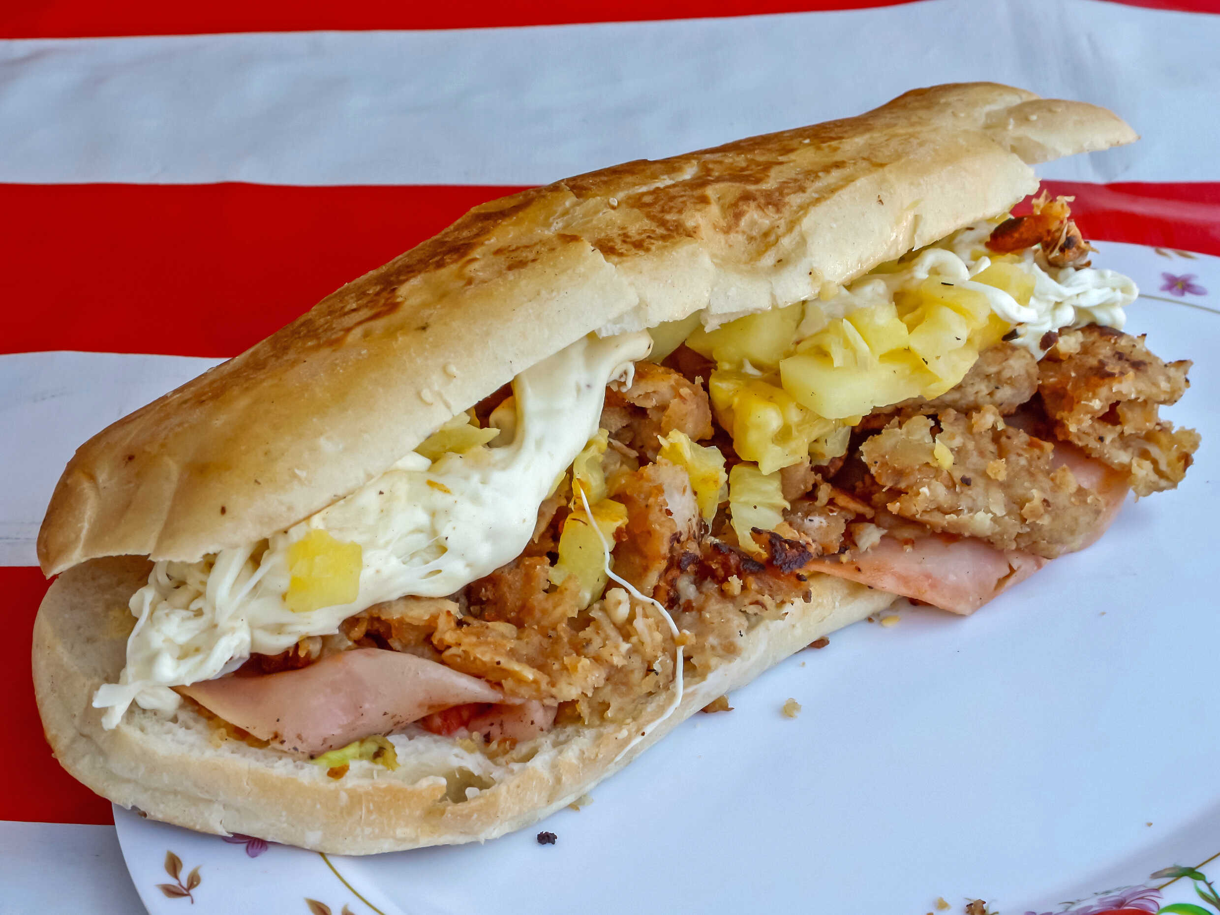 Con milanesa, salchicha, quesillo y piña.