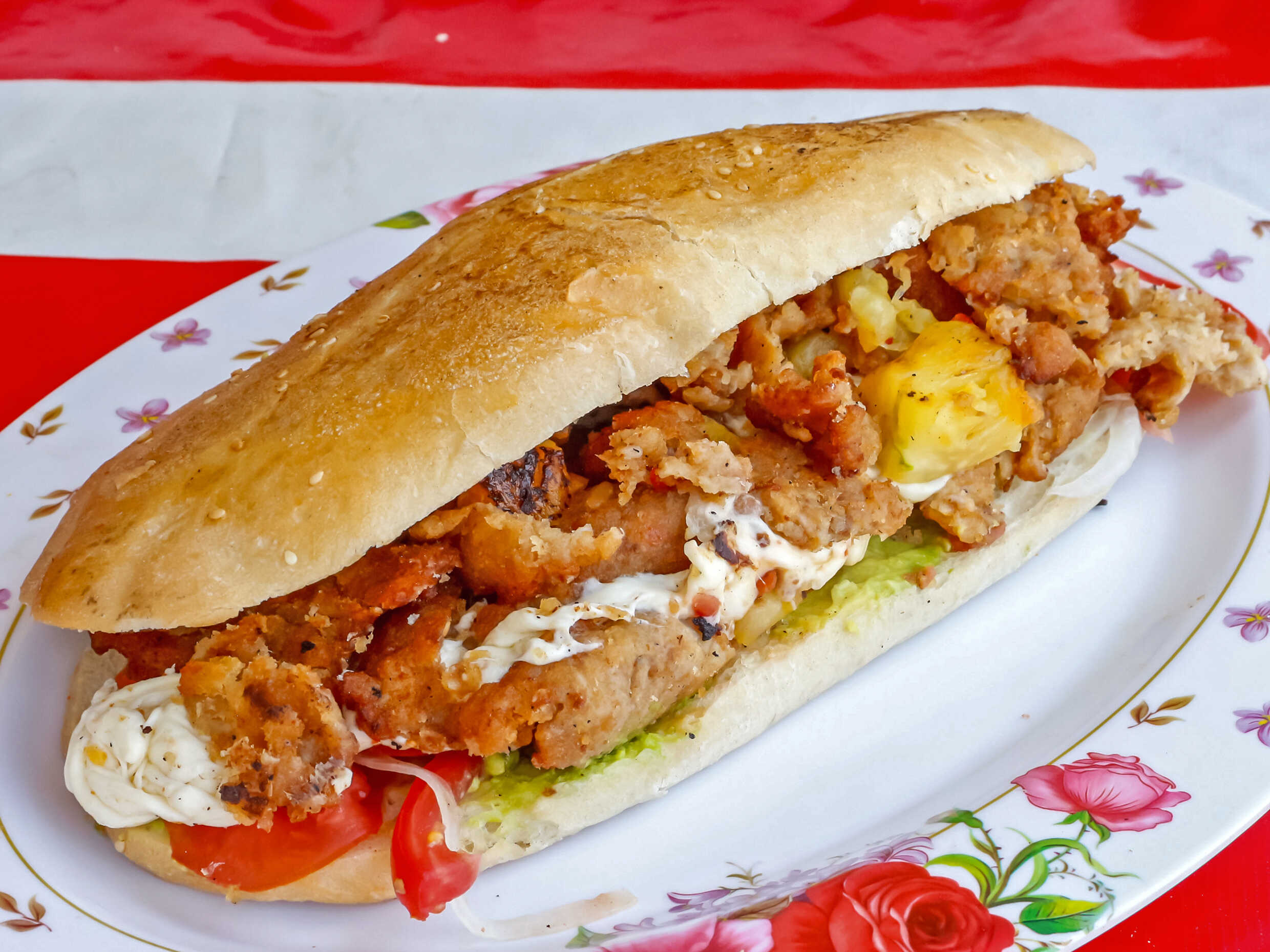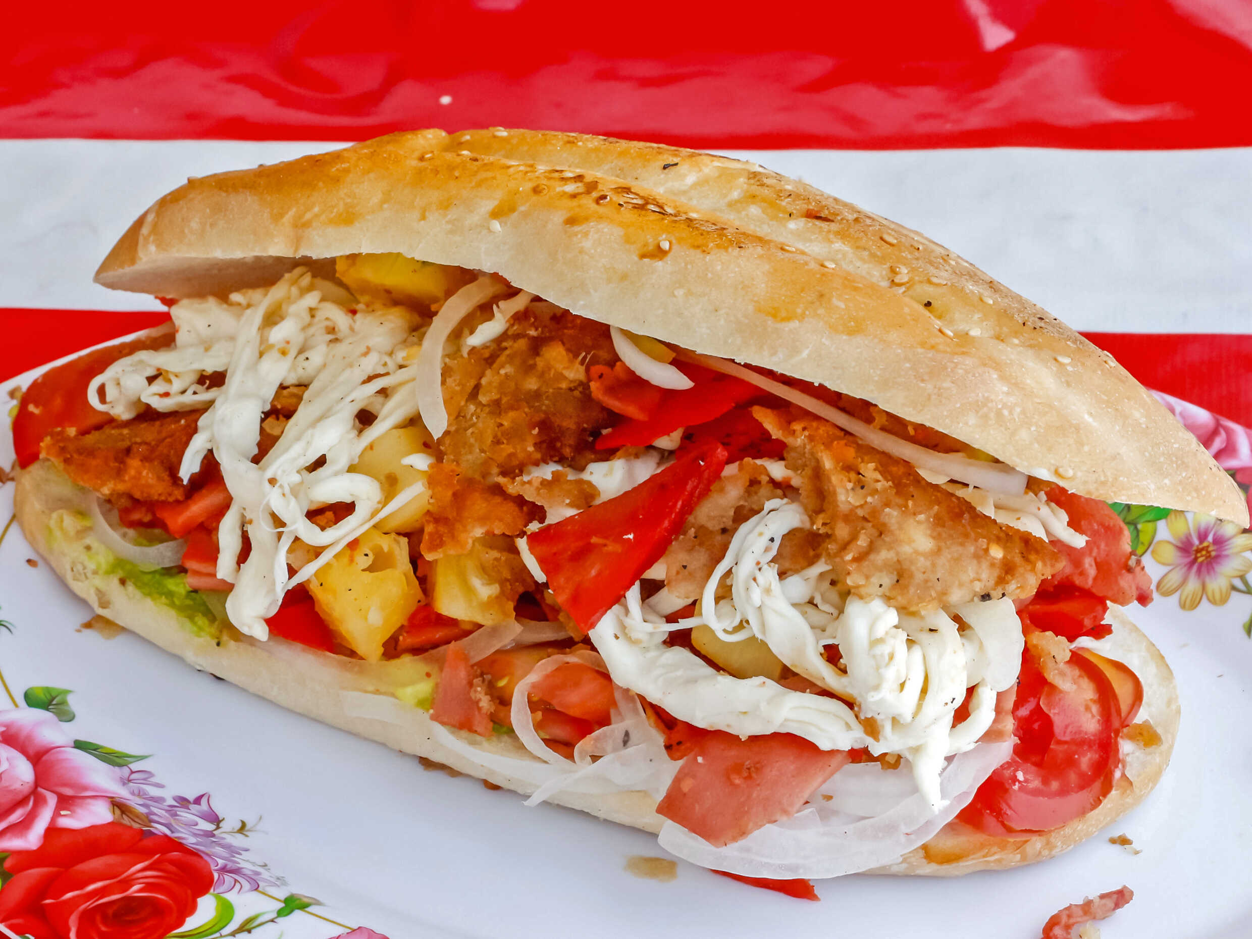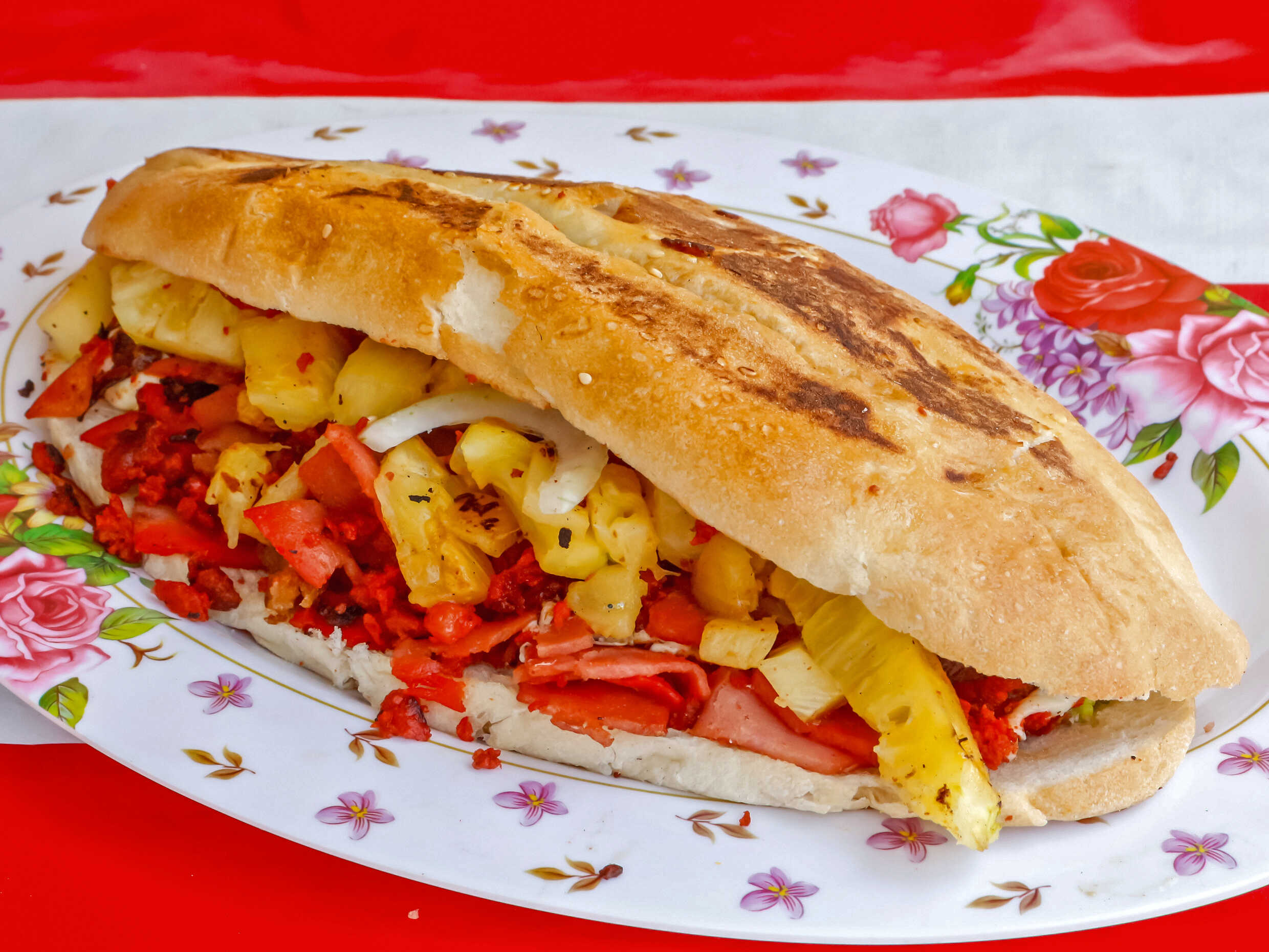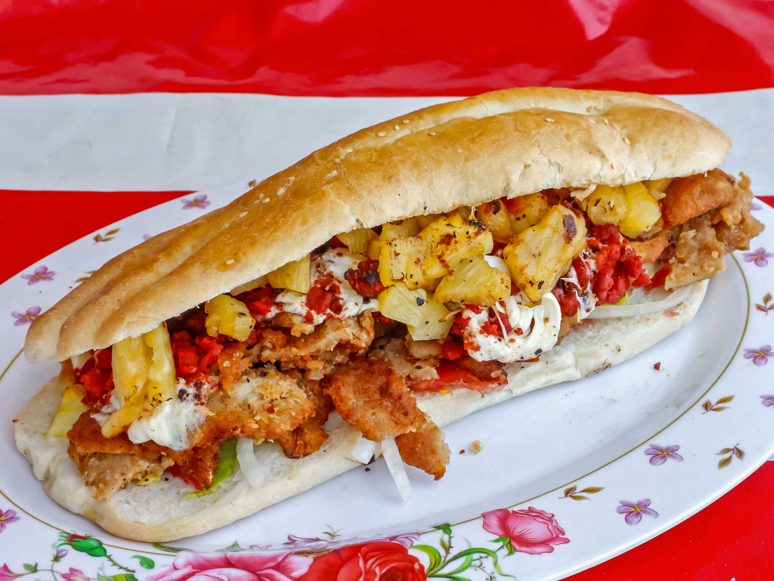 Con milanesa, salchicha, quesillo y piña.