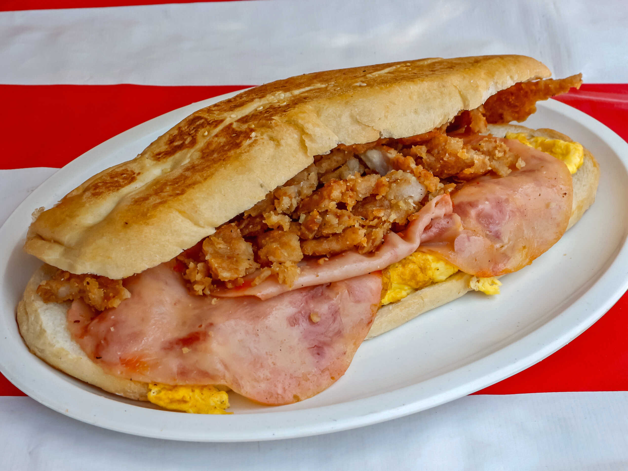 Con huevo, queso amarillo y jamón.