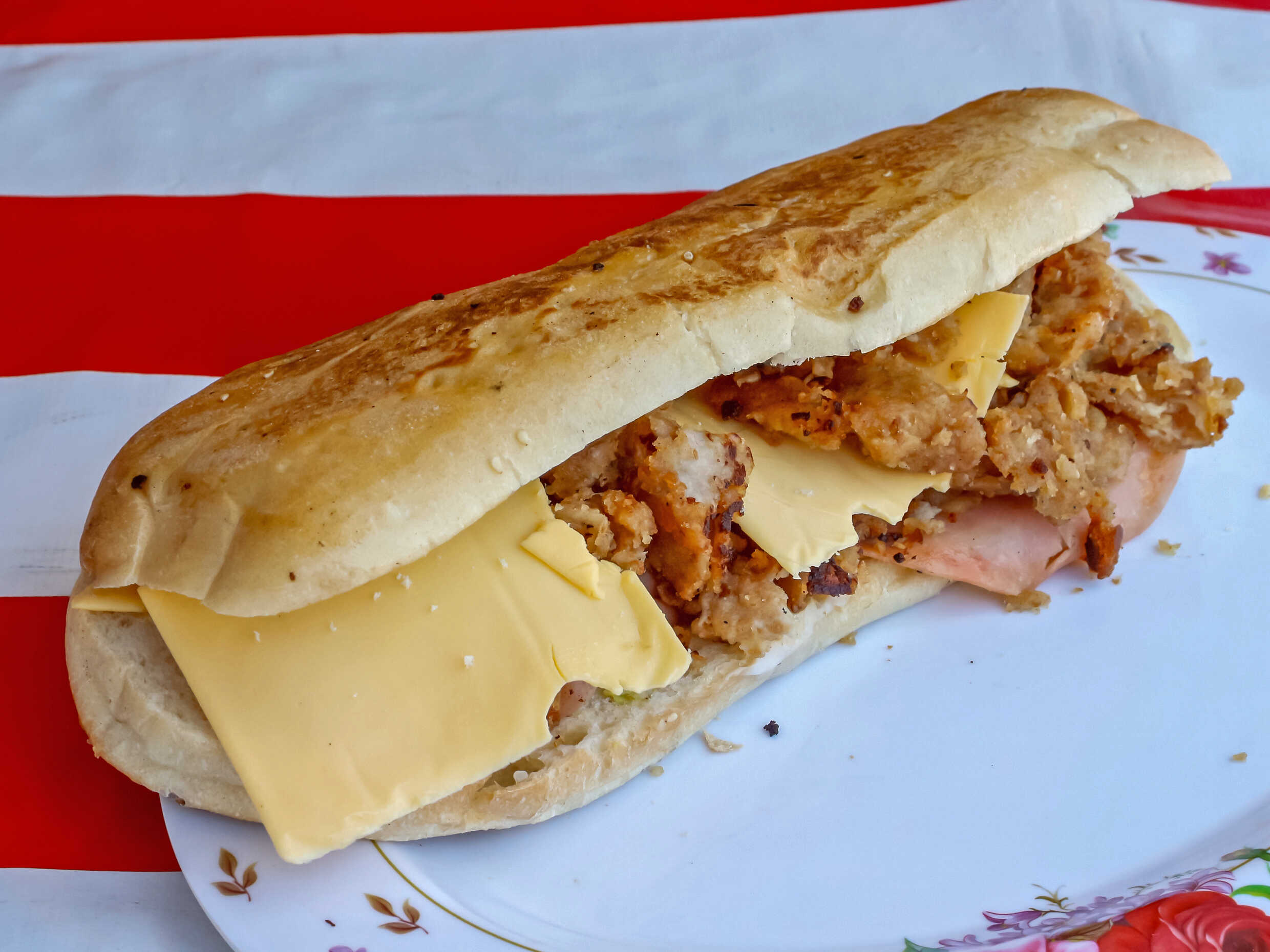 Con milanesa, piña y quesillo.