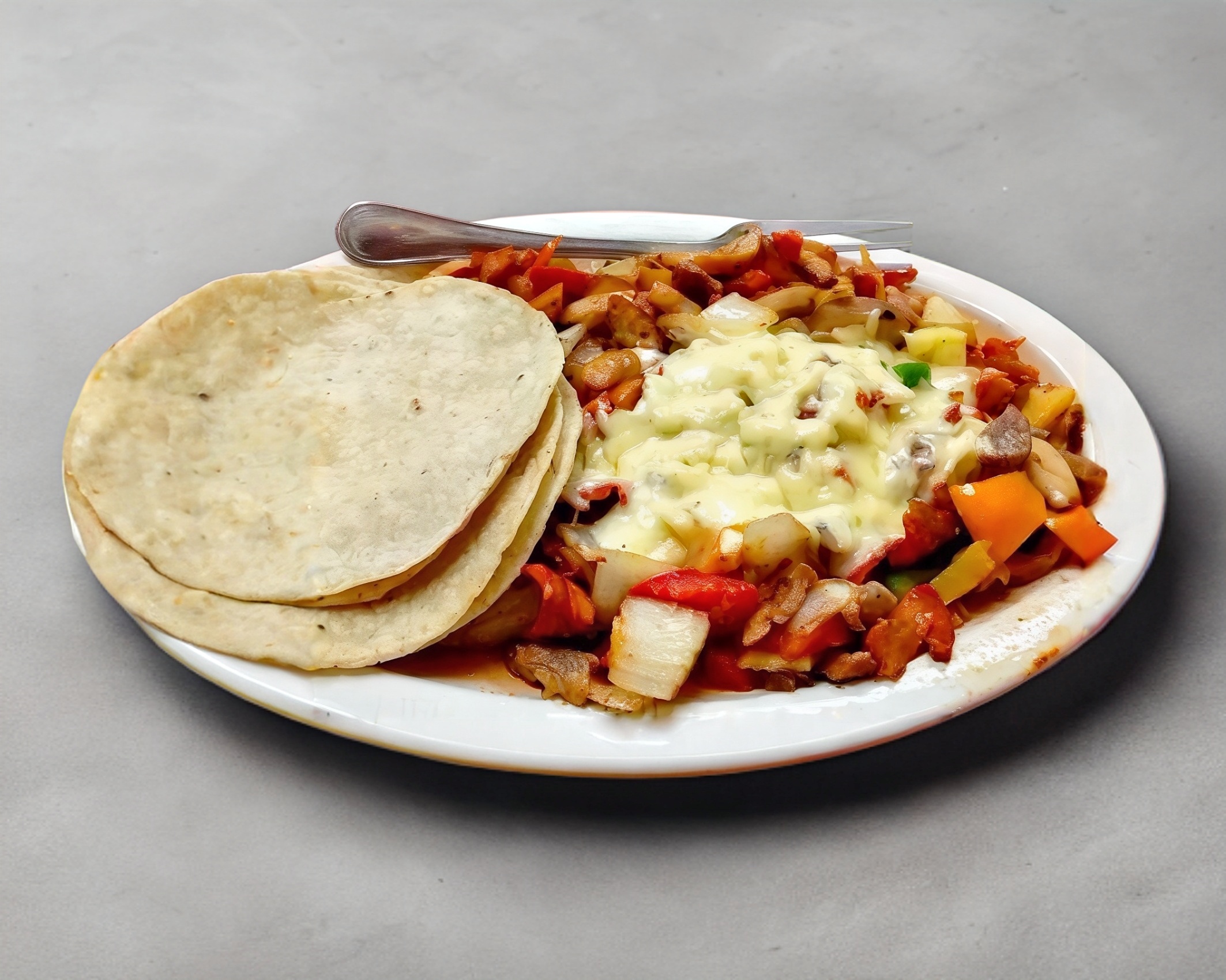Bistec, jamón, tocino, quesillo, morrón y cebolla.