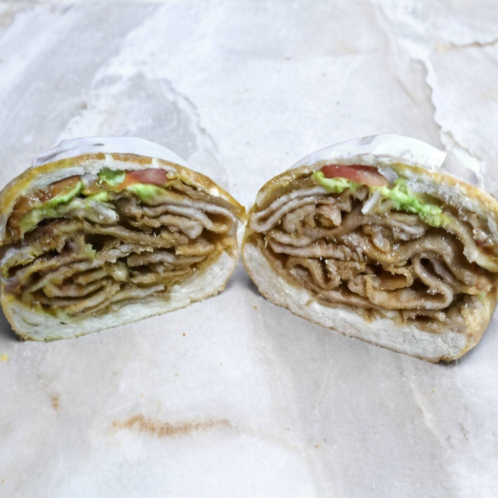 1 pieza individual: torta tradicional de milanesa. Telera de tamaño y medio con ajonjolí, mayonesa, jitomate, aguacate, cebolla, chile chipotle, rajas y milanesa de cerdo (aprox. 250 g).