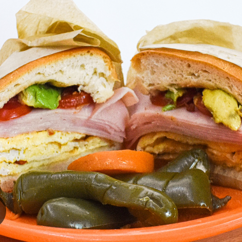 Jamón huevo y quesillo con la base de frijol, mayonesa, aguacate, jitomate y chipotle.