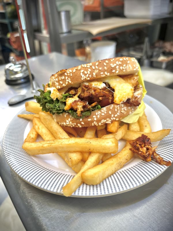 Sandwich con pollo, jamón, queso blanco, queso amarillo y papas
