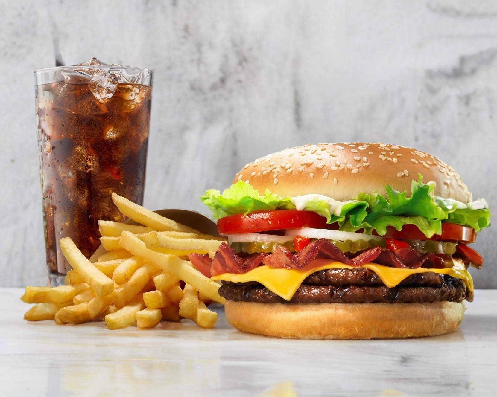 Hamburguesa de tu elección con aguacate, jitomate, cebolla y cátsup. Incluye papas a la francesa y bebida.