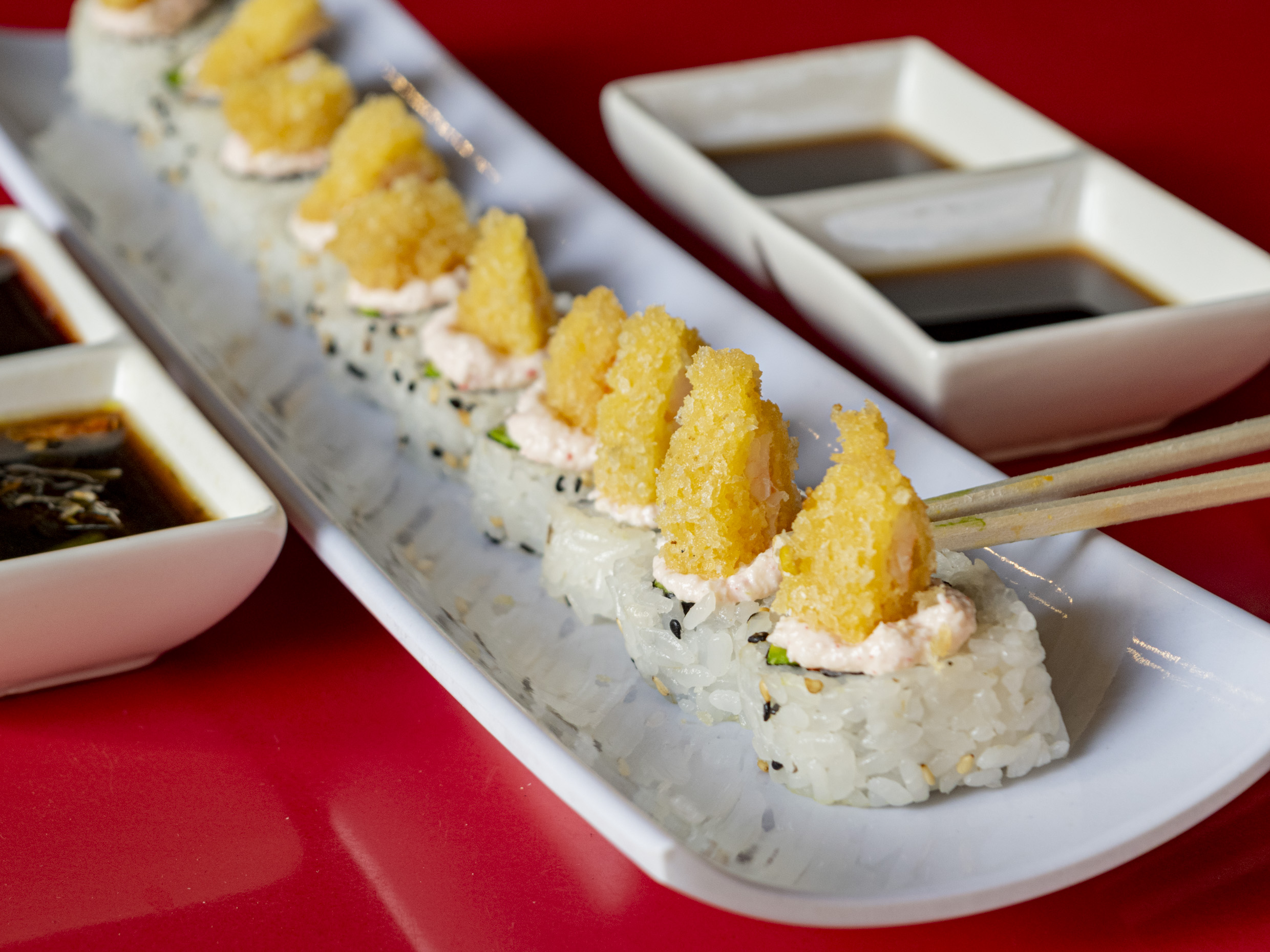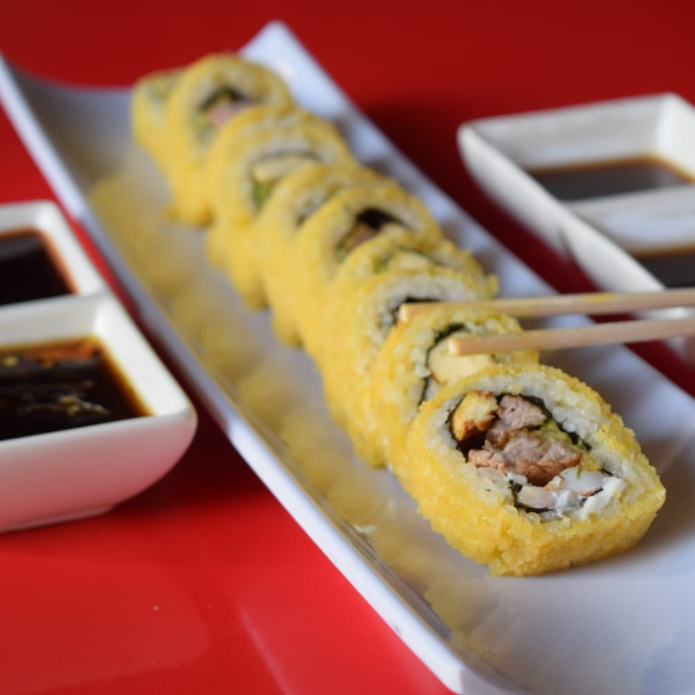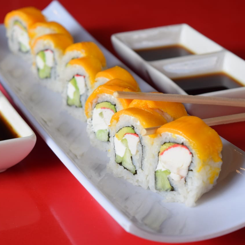 Camarón empanizado, aguacate y queso crema. XF: mango, aguacate, salsa dulce y ajonjolí. 10pz.