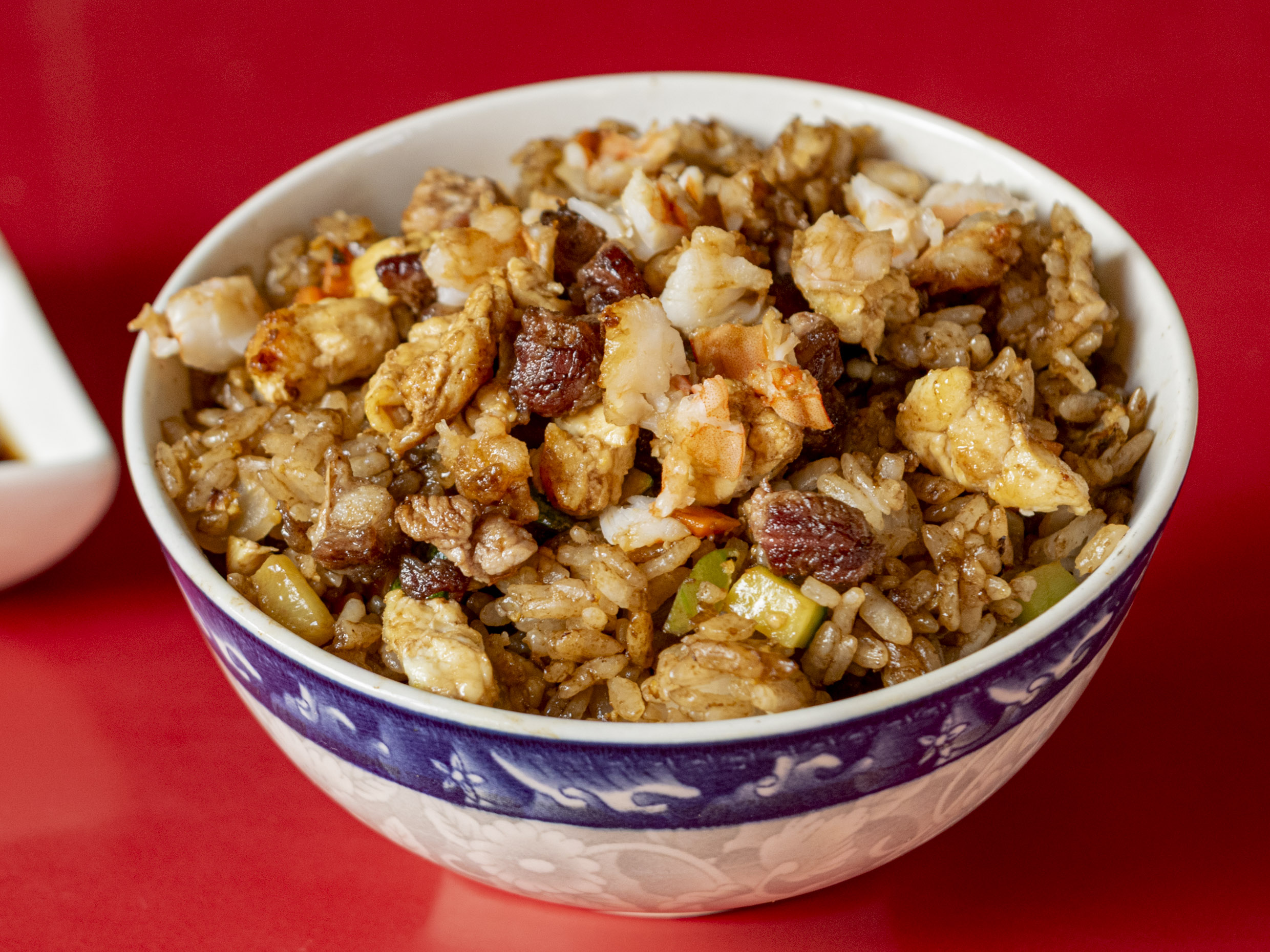 Arroz frito, calabaza, zanahoria, cebolla huevo, pollo, res y camarón.(1/2 litro)