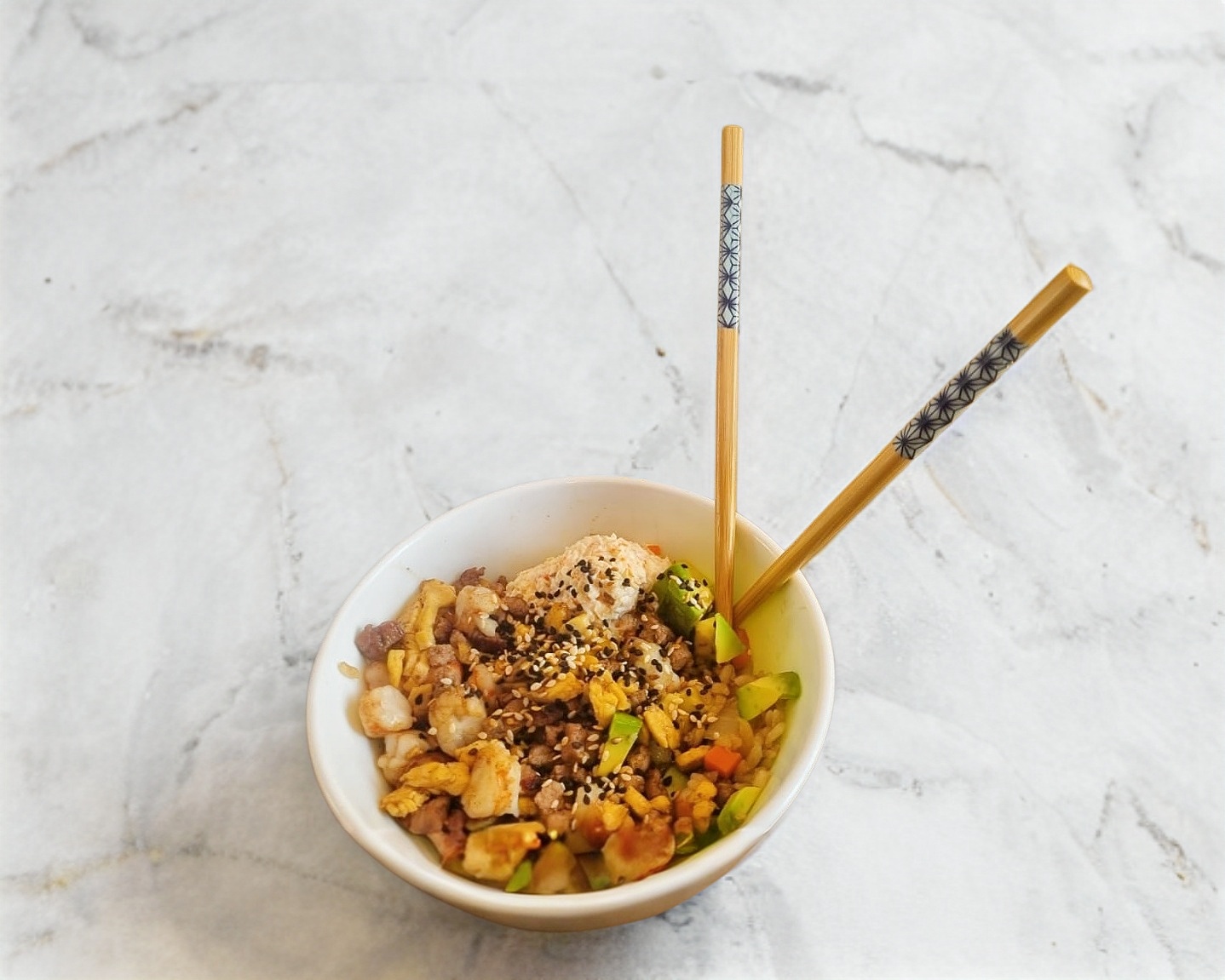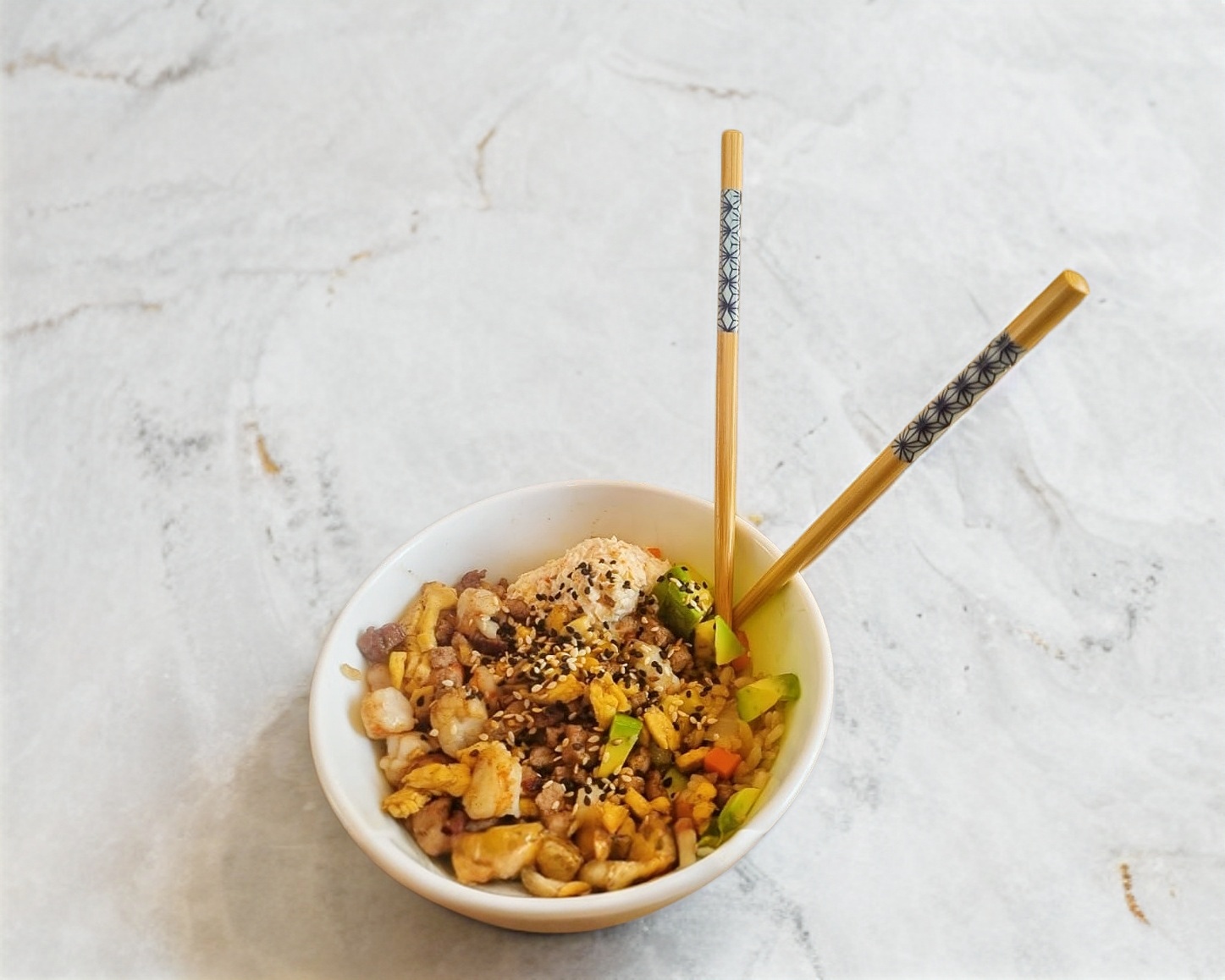 Arroz frito sazonado ala plancha con verduras y ajo frito.