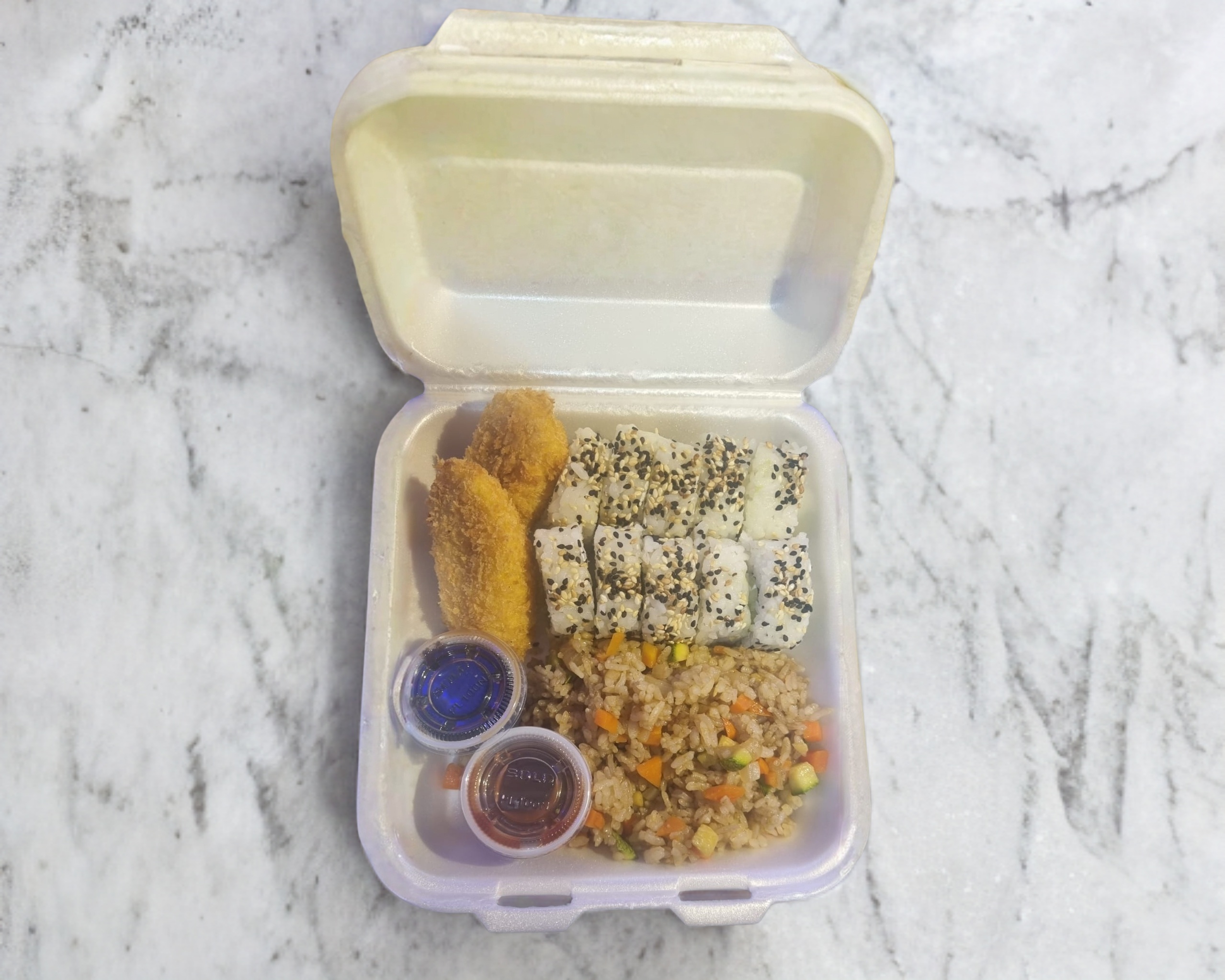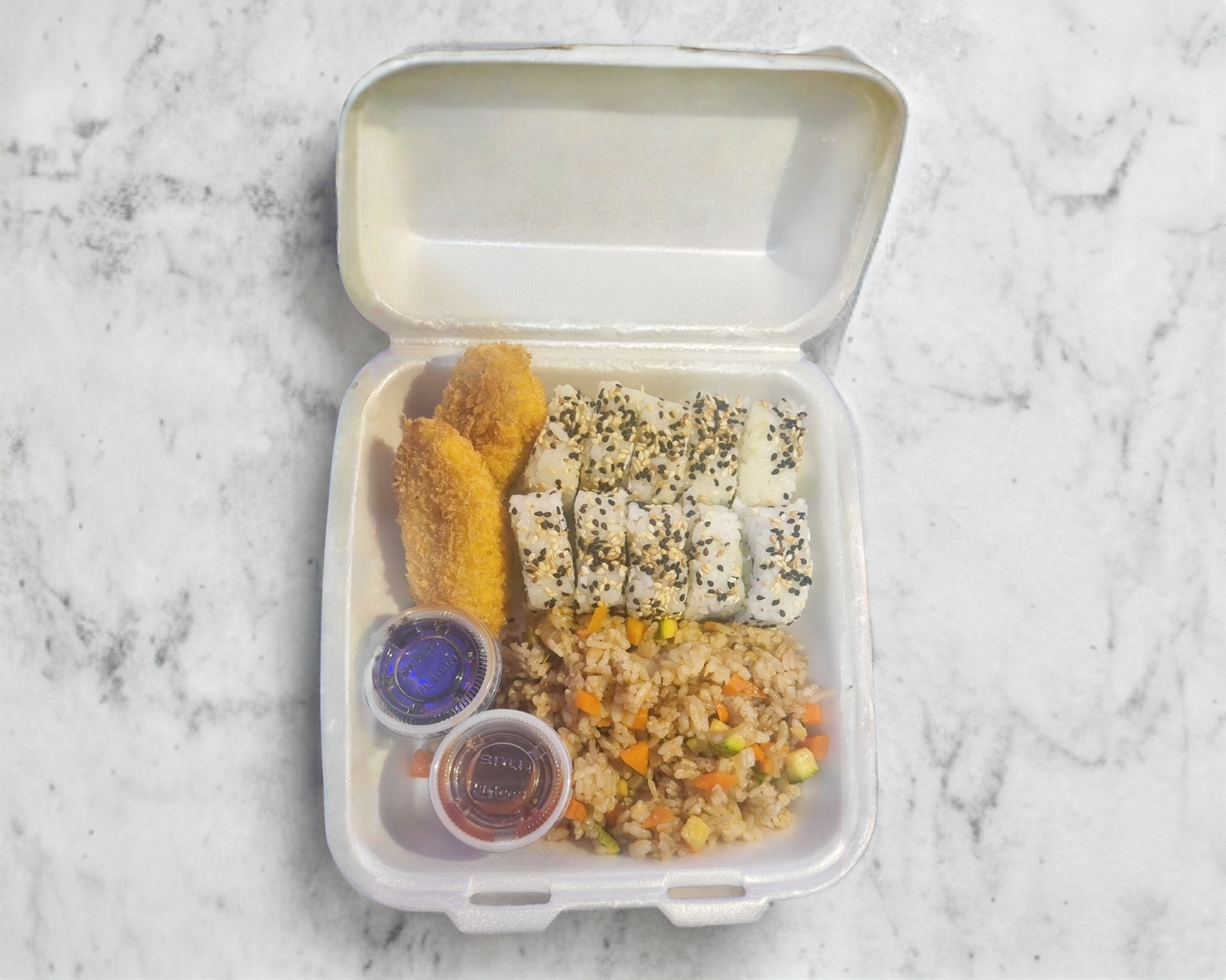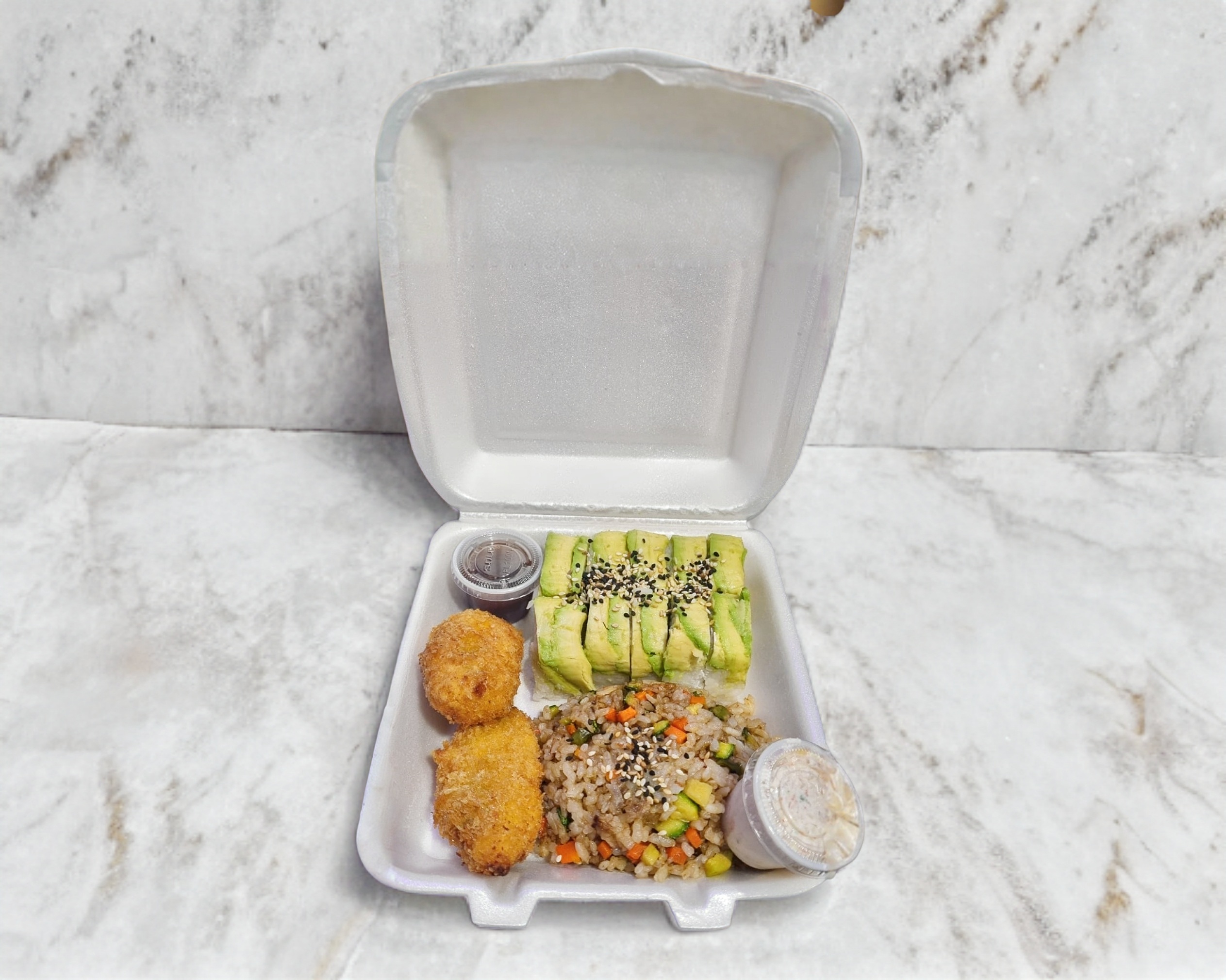 rollo 10 pz media porcion de yakimeshi de verduras 2 pz de kushiague de platano 1 refresco de lata jarrito
