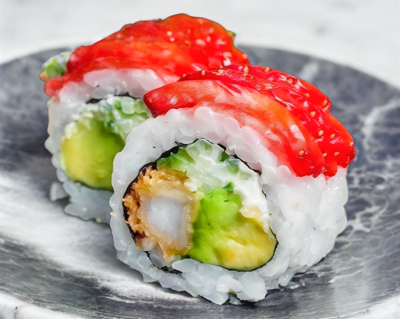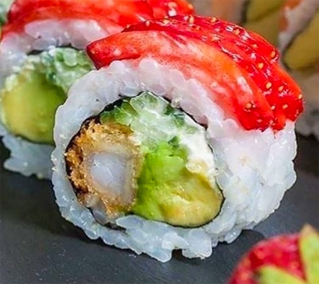 XD agucate surimi empanizado XF queso philadelphia fresa y ajonjoli caramelizado salsa de soya y anguila