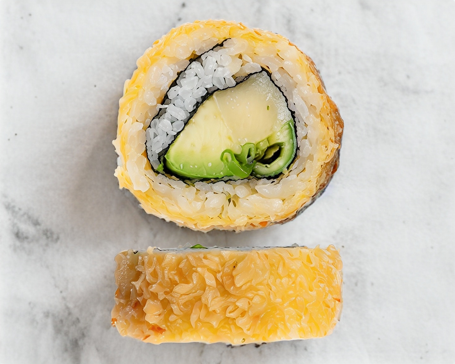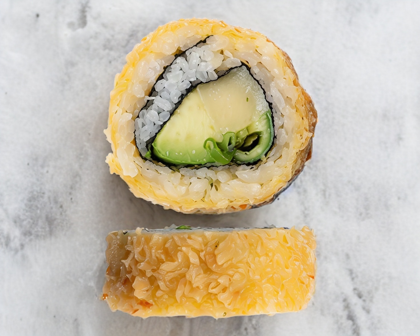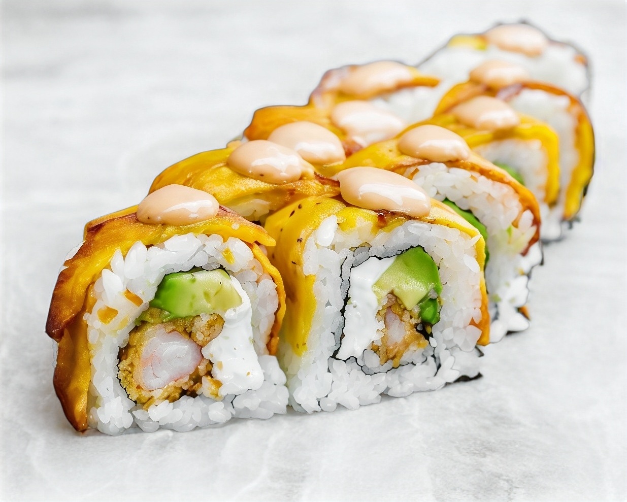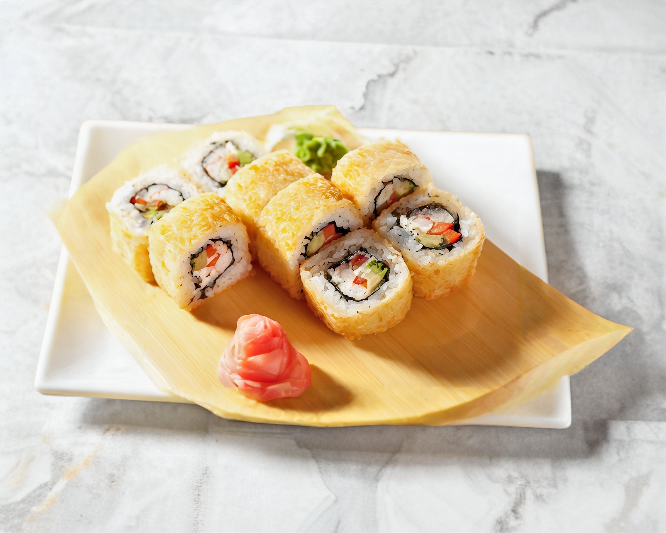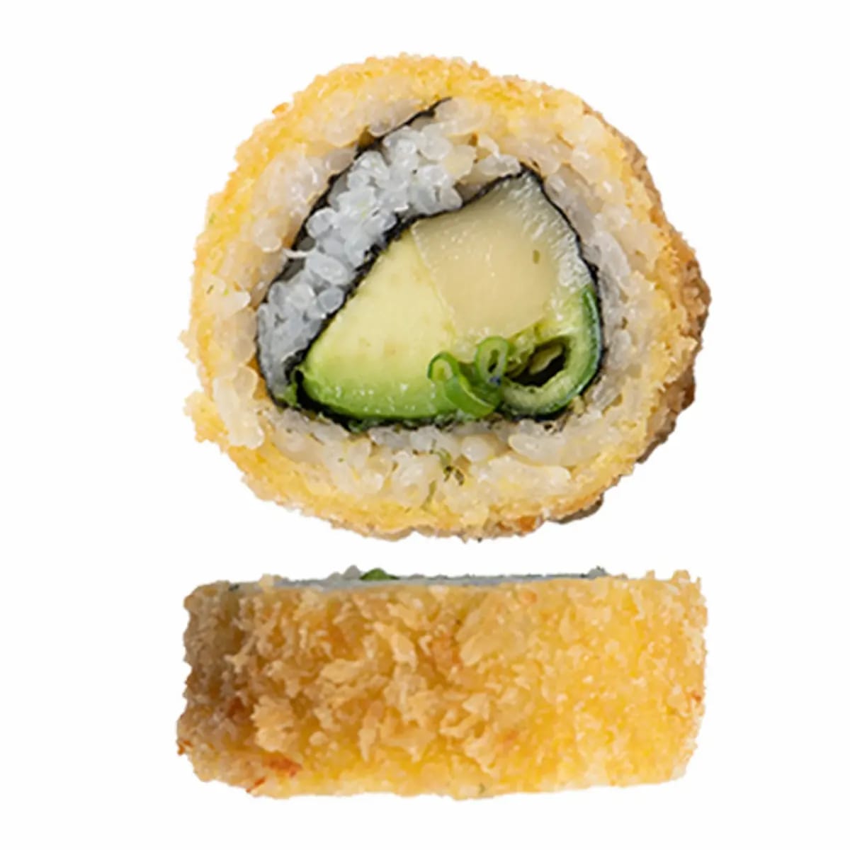 Por dentro surimi empanizado, aguacate, Philadelphia y por fuera verdura tempurizada.