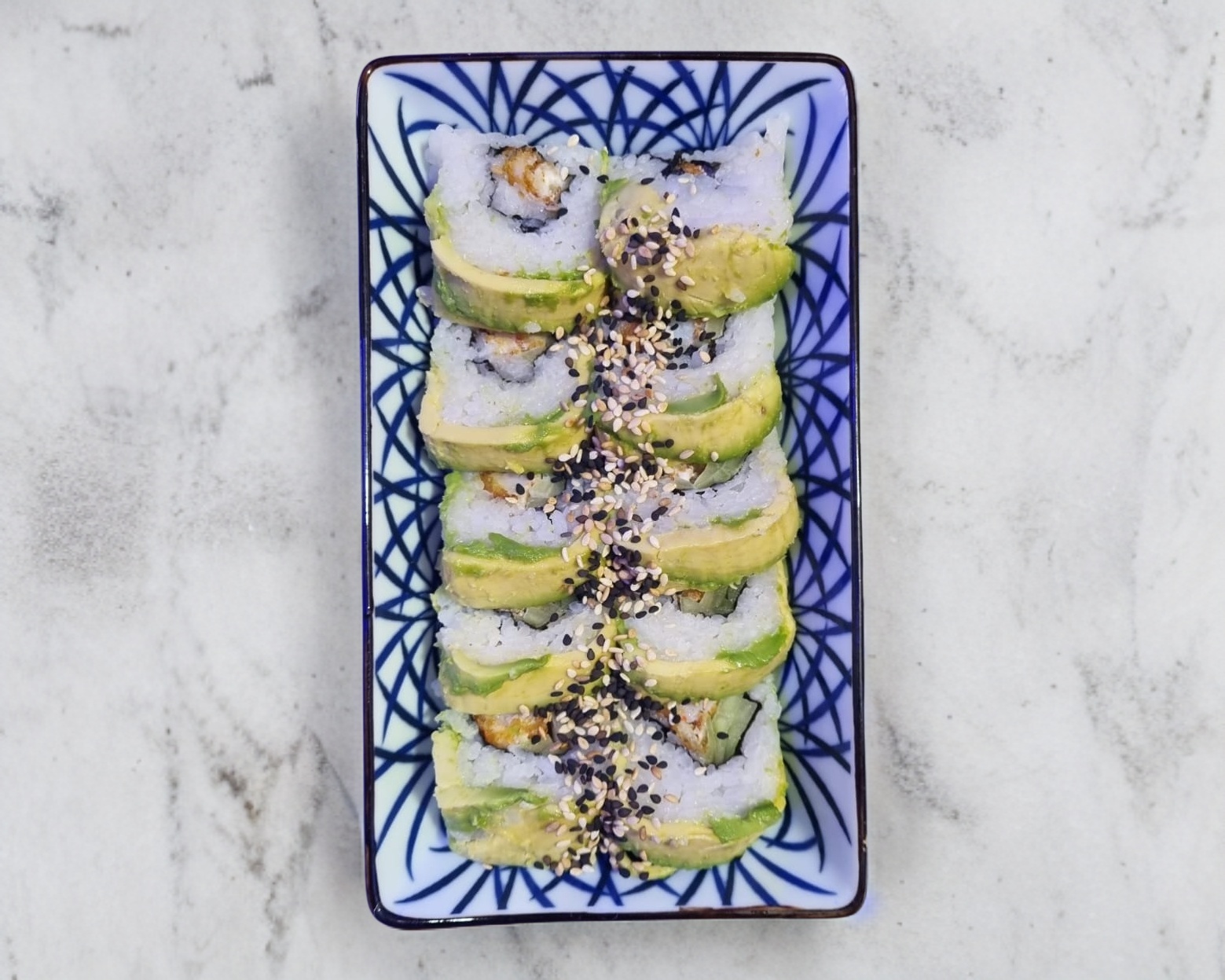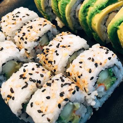 Por dentro aguacate, pepino y queso Philadelphia, por fuera ajonjolí y salsas de soya.
