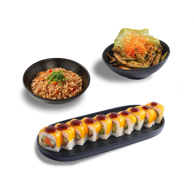 4 porciones de yakimeshi con verduras y 5 rollos de sushi a elegir. Apto para 3–4 personas.