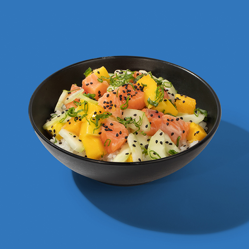 Tazón de arroz avinagrado, salmón fresco, mango y pepino, aderezados con crema de coco al jengibre; cebollín y ajonjolí negro.