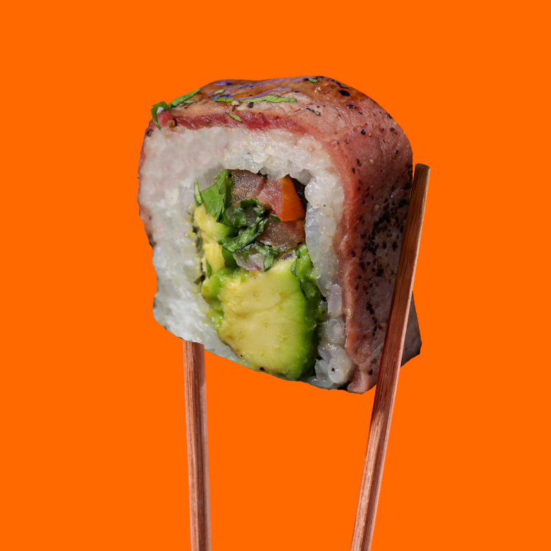 10 piezas | Pasta de cangrejo empanizado, salsa Tampico por dentro; atún y aguacate por fuera; con salsa chipotle, masago y cebollín.