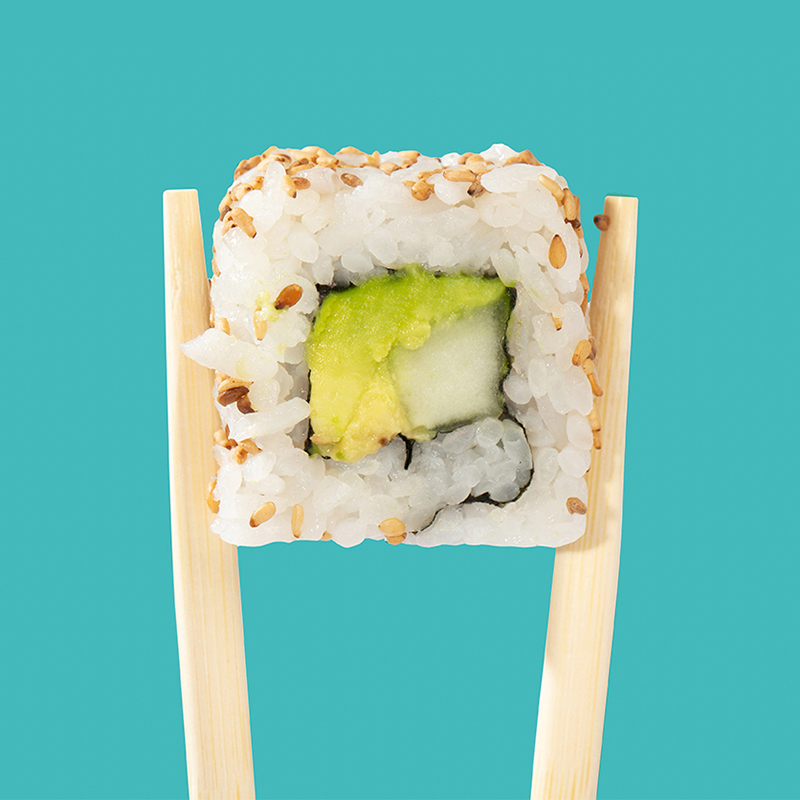 10 piezas | Aguacate, pepino y pasta de cangrejo por dentro; ajonjolí por fuera.