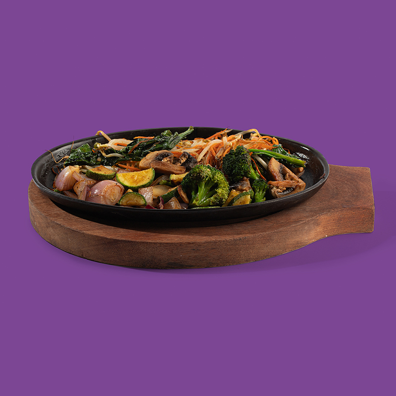 Mezcla de vegetales a la plancha: brócoli, pimiento, calabaza, champiñón, espinaca, germen de soya y cebolla. Acompañado con salsa de ajonjolí