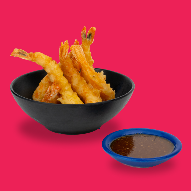 Camarones capeados en una mezcla de harina de textura ligera y crujiente, servidos con sopa Misoshiru y fondo tempura.