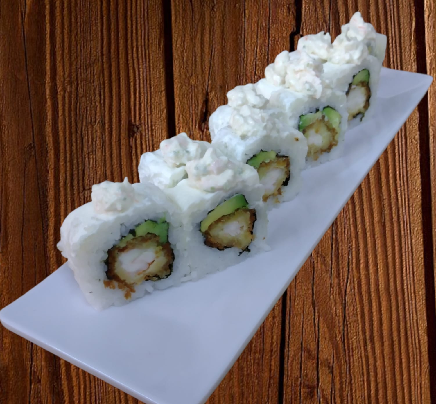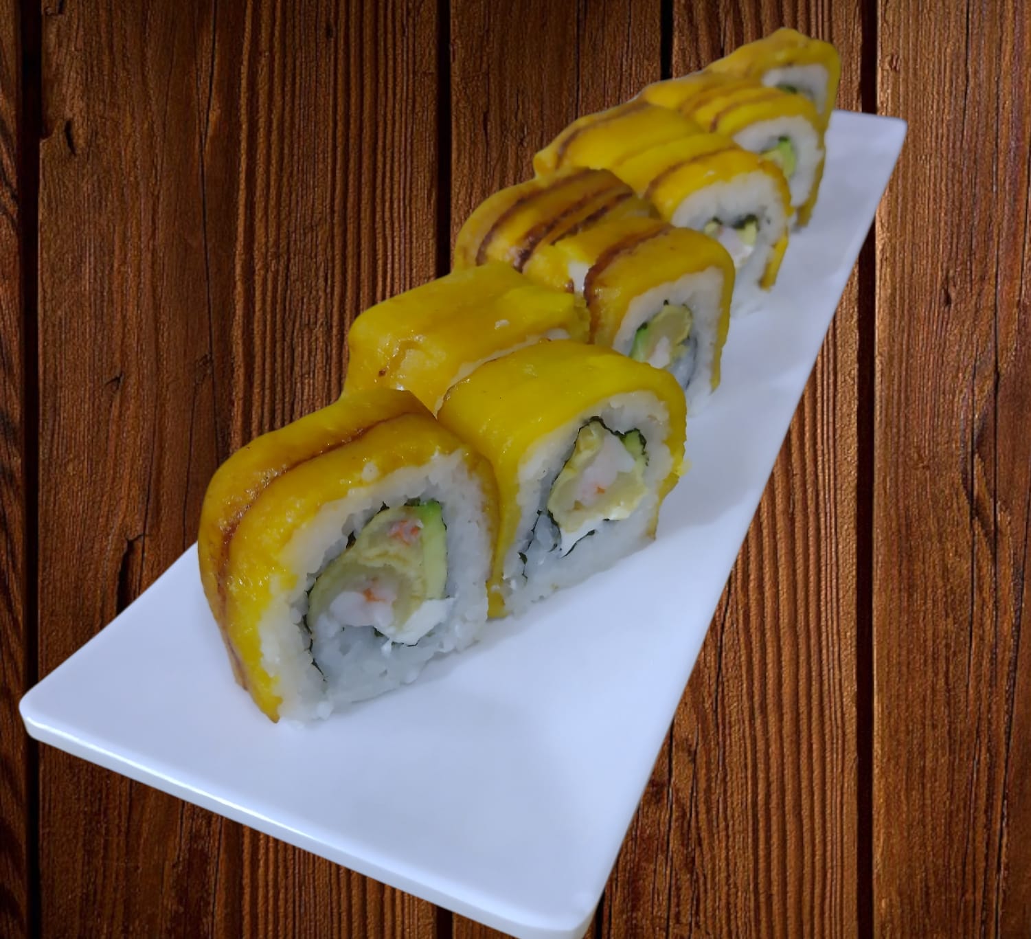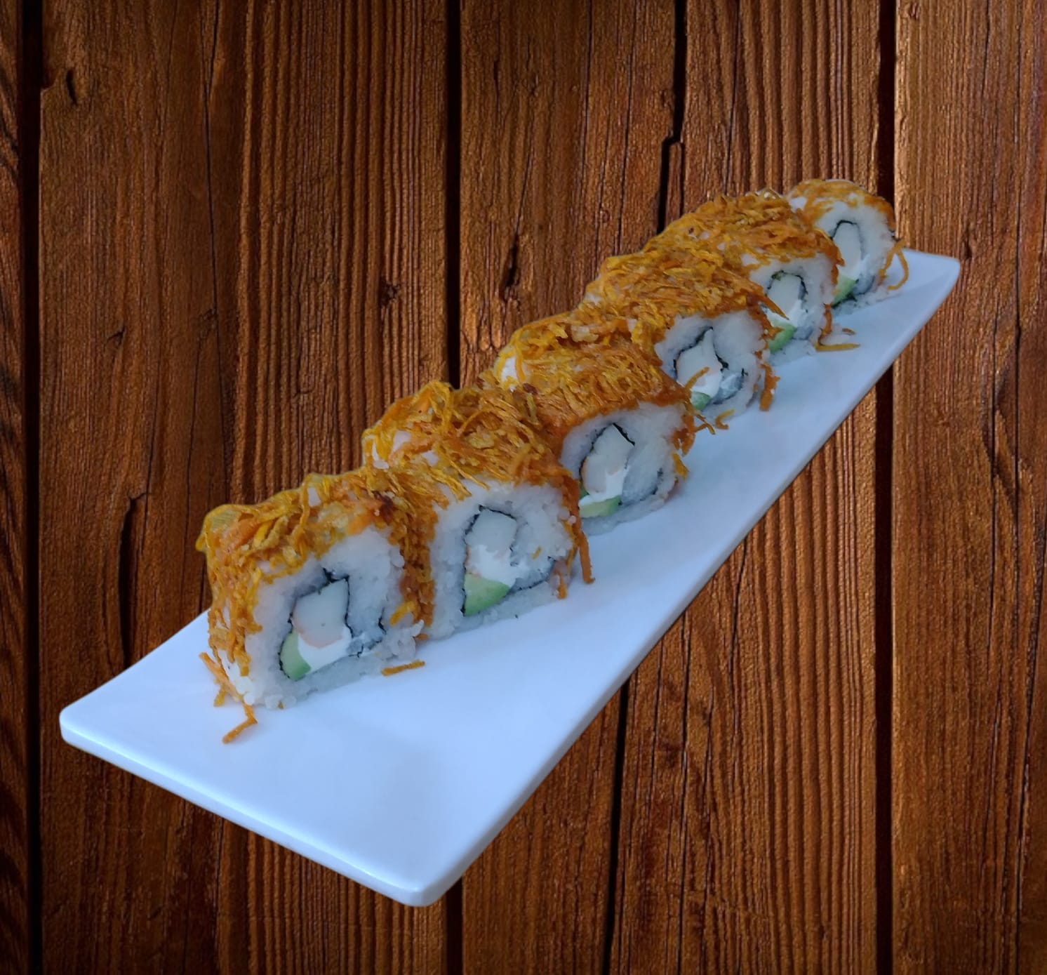 Por dentro camarón empanizado y aguacate. Por fuera queso philadelphia, salsa tampico y ajonjoli.