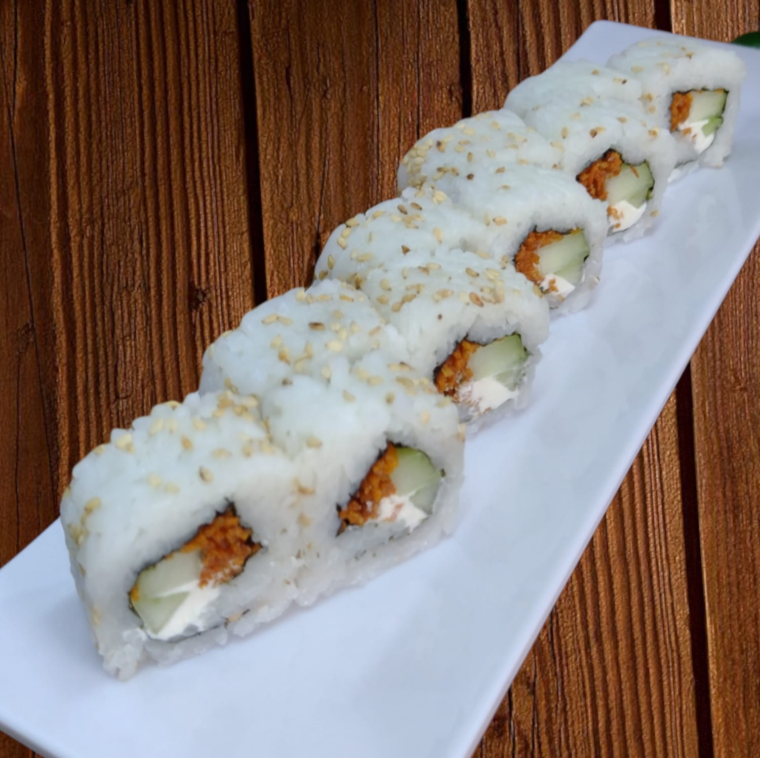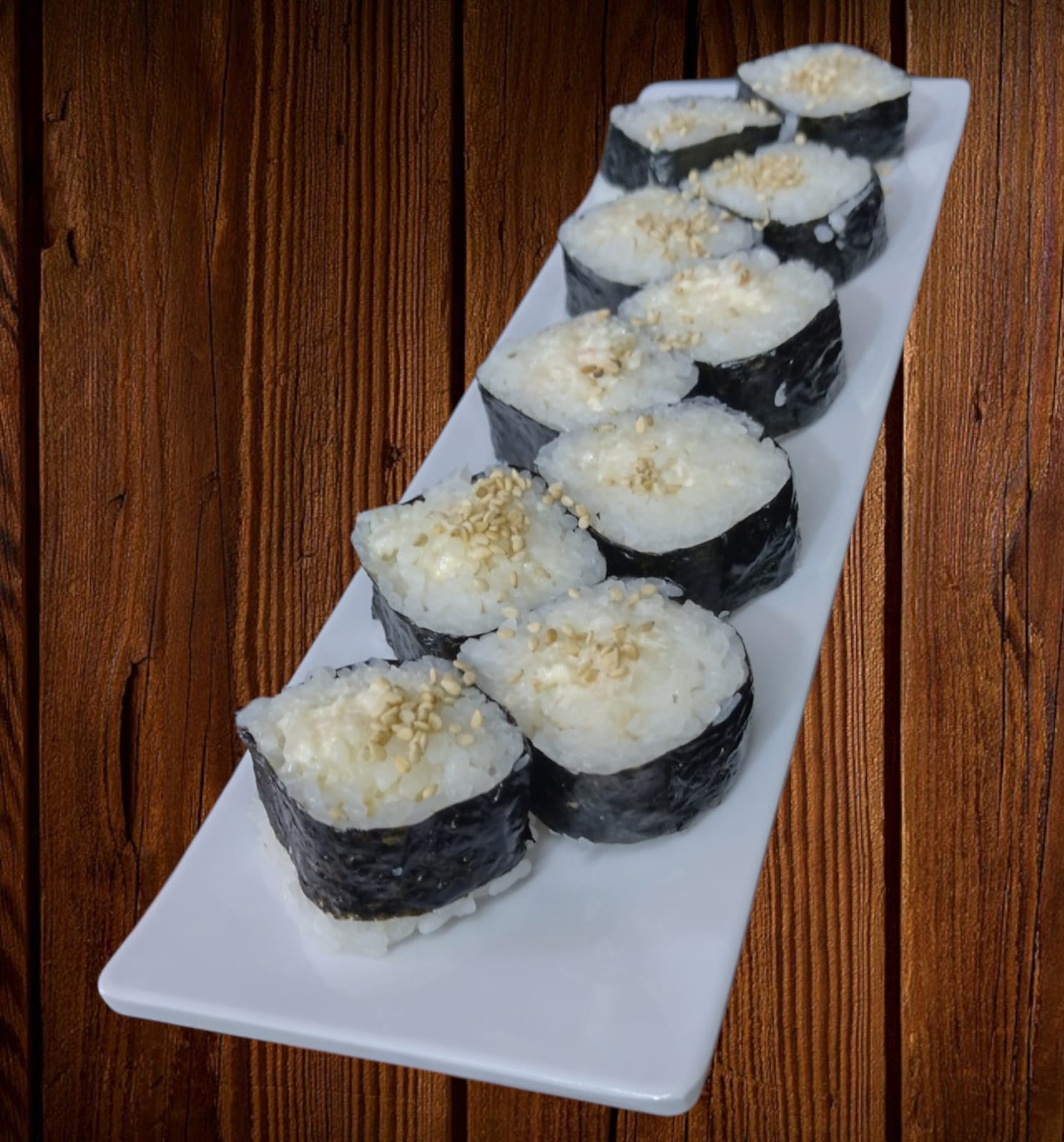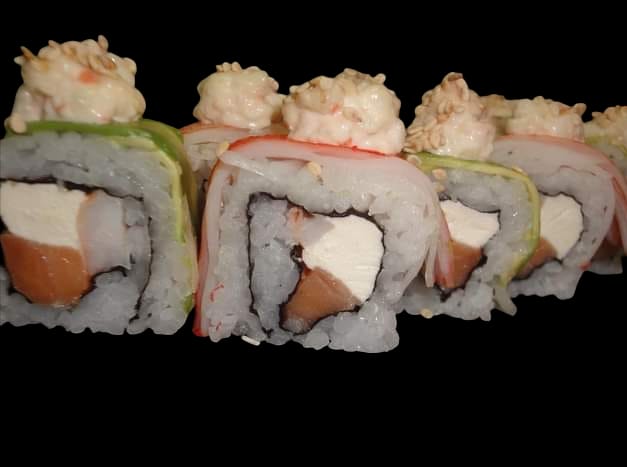 Por dentro camarón empanizado y aguacate. Por fuera queso philadelphia, salsa tampico y ajonjoli.
