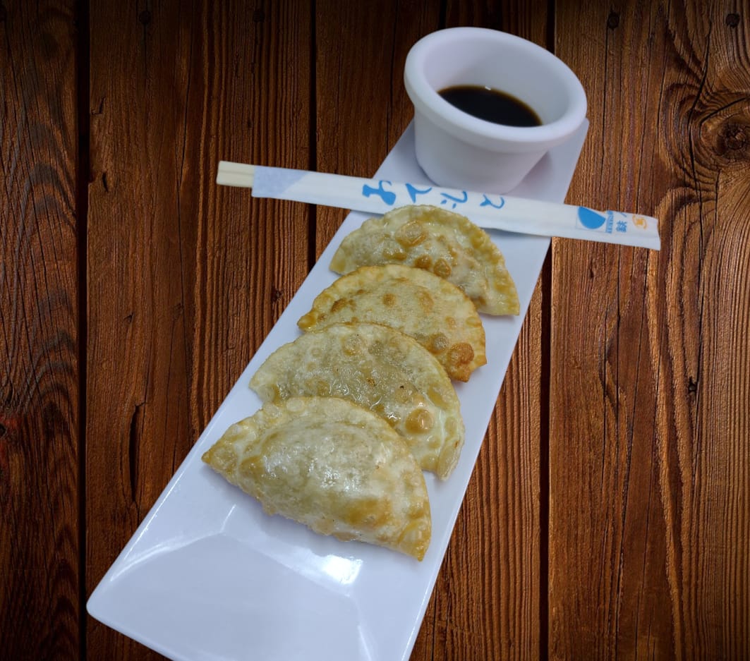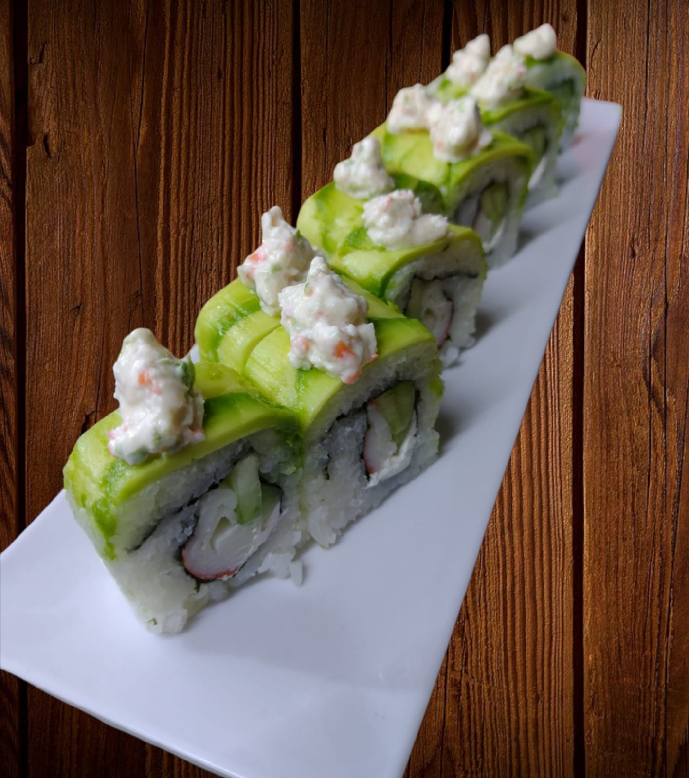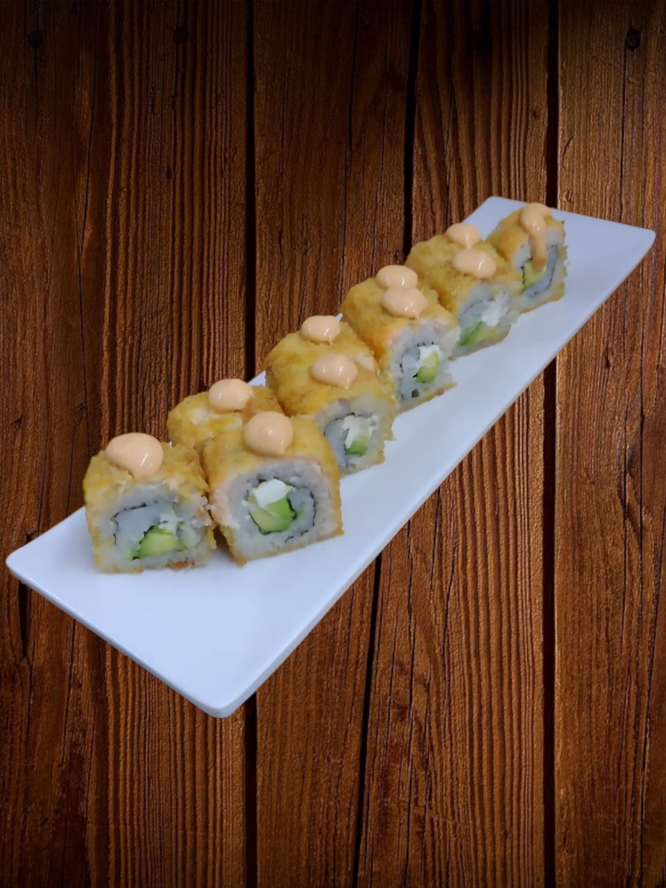 Por fuera camarón o pollo, rollo empanizado, por dentro aguacate y espinaca, servido con salsa dulce.