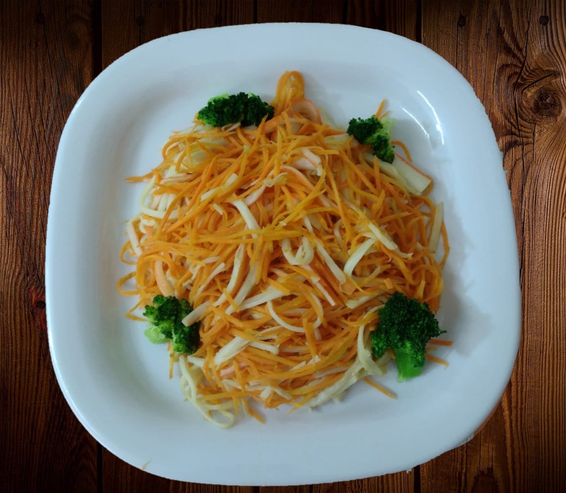 Surimi, zanahoria, brócoli sazonado con mantequilla.