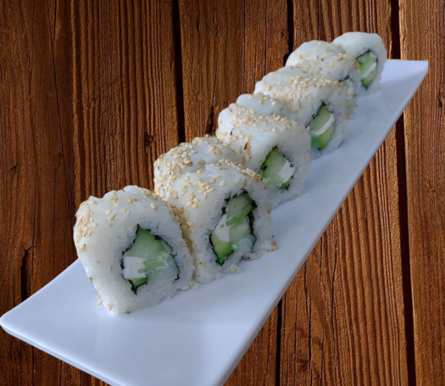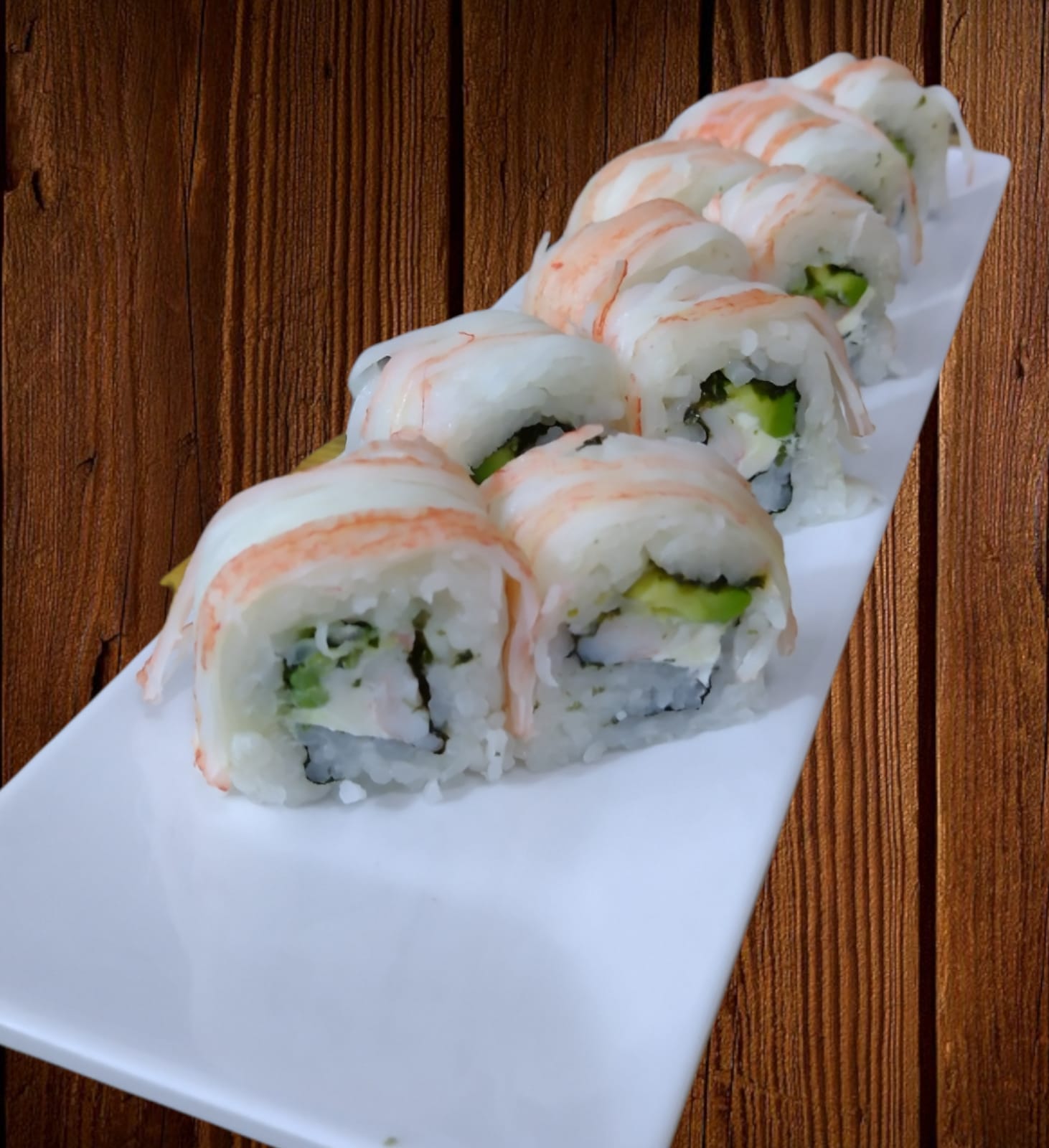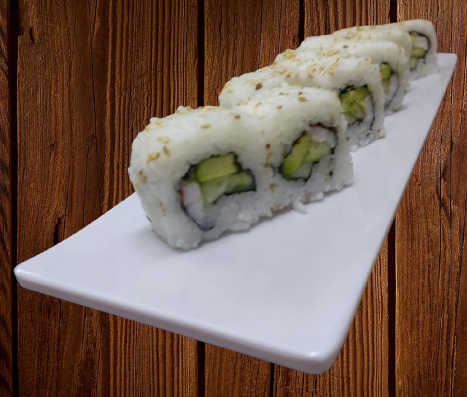 Aguacate, pepino a escoger salmón, camarón o surimi.