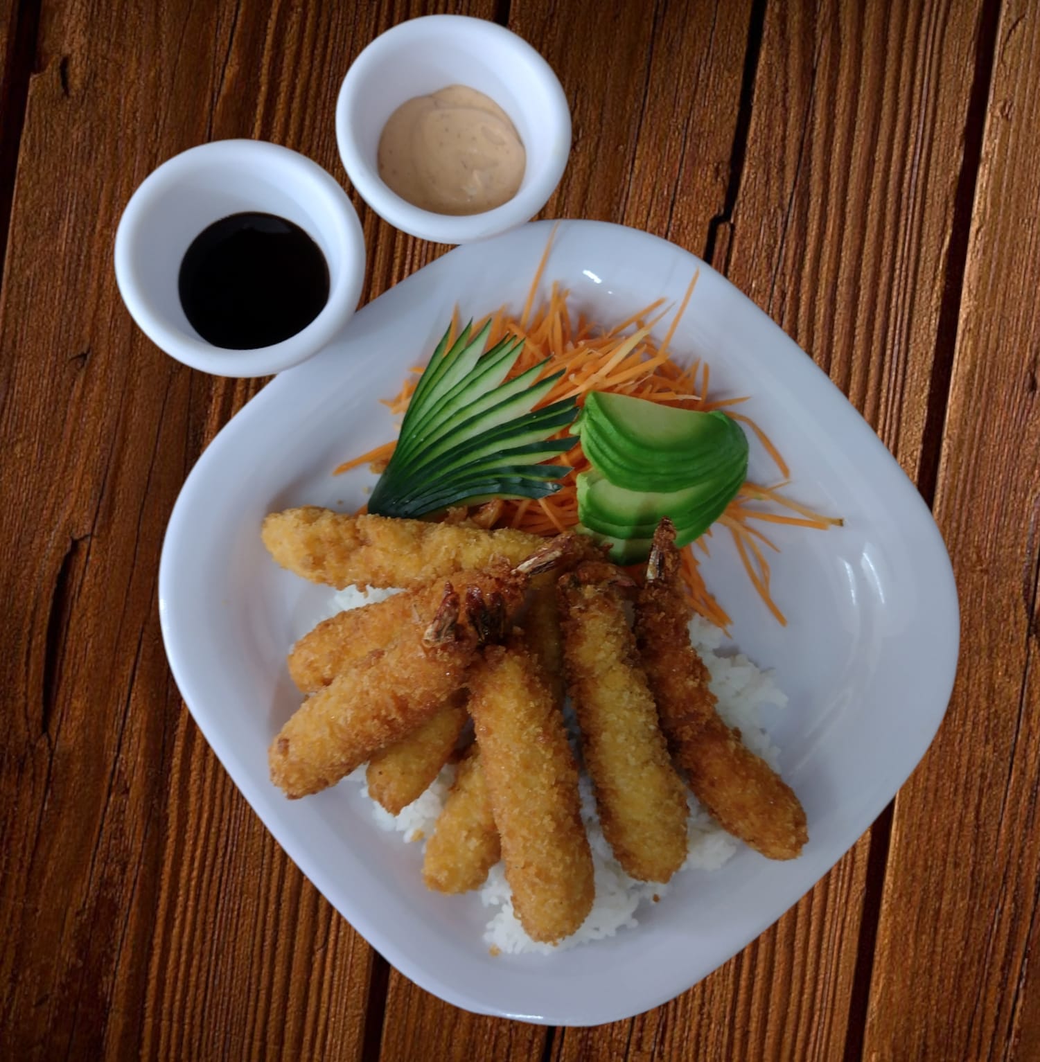 Camarones empanizados, acompañados con gohan y una ensalada.