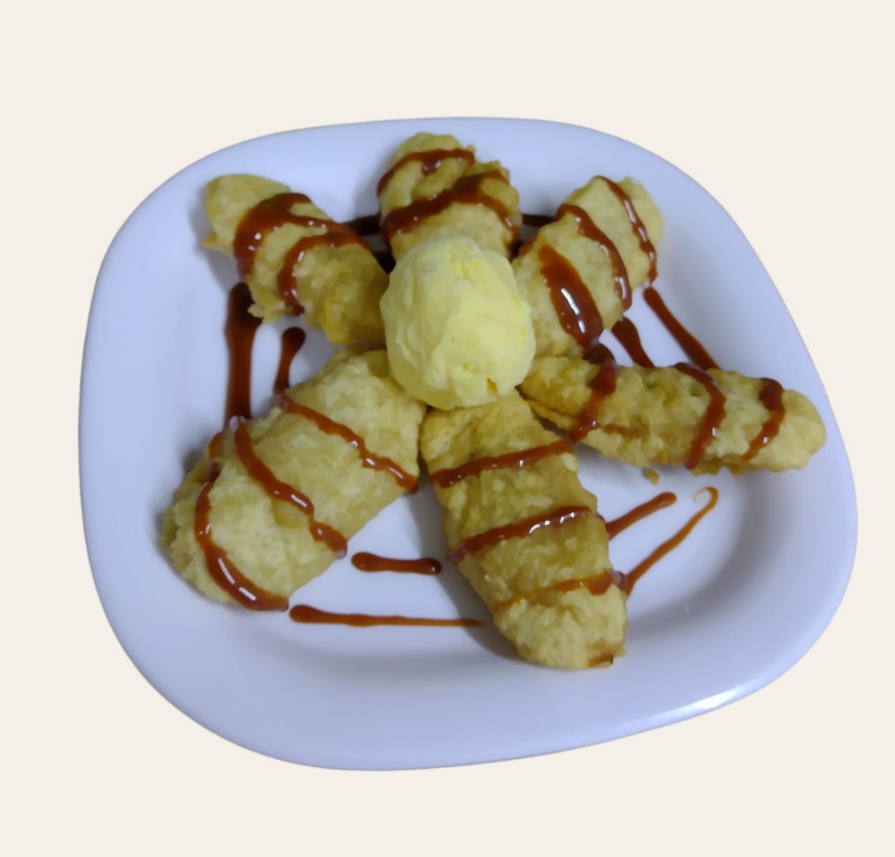 Plátano macho capeado con harina tempura con una bola de helado napolitano