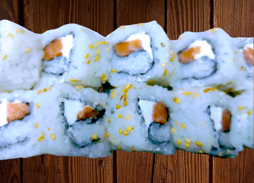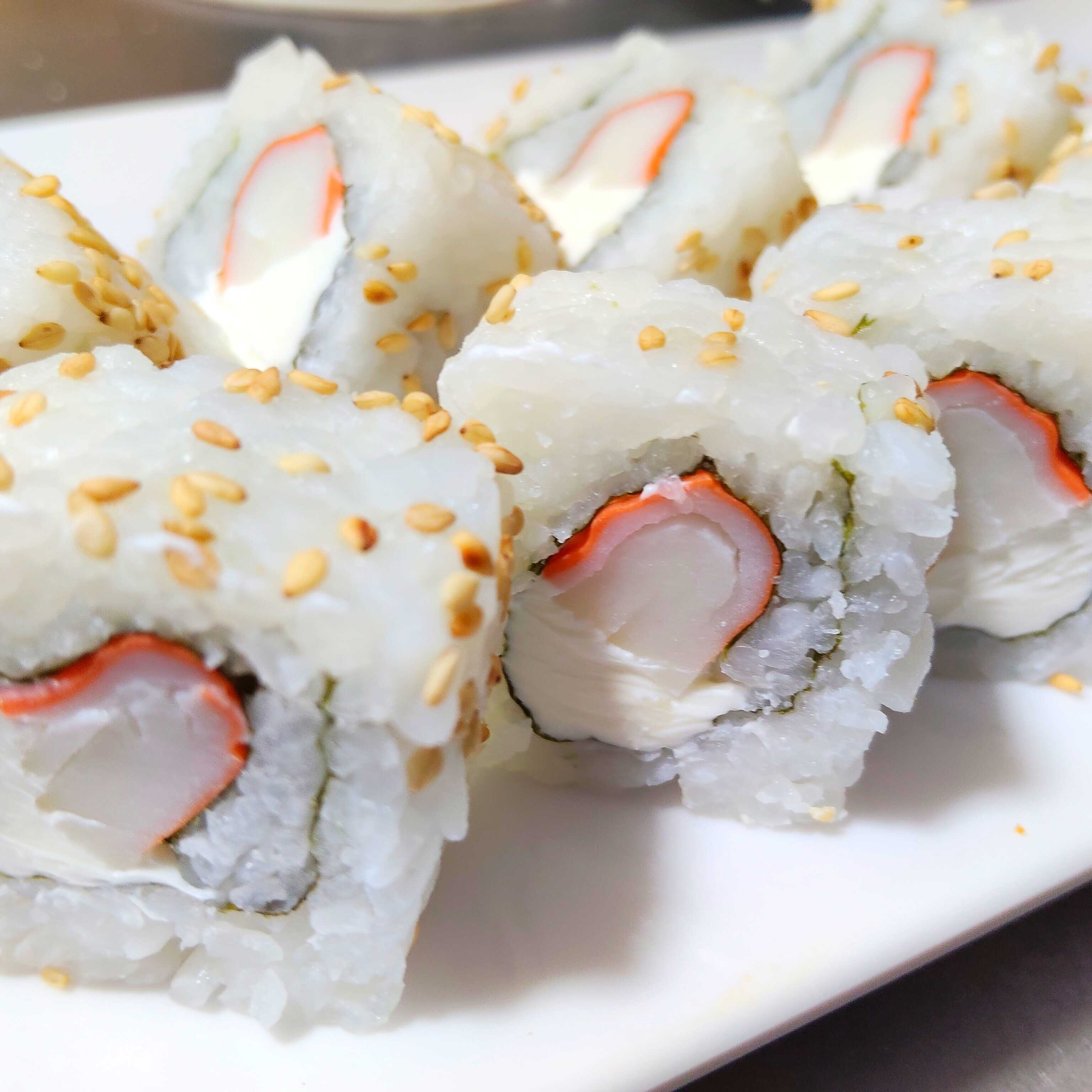 Por dentro camarón, queso philadelphia y aguacate. Por fuera surimi y ajonjolí