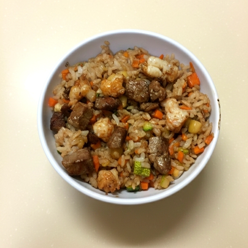 Arroz frito con verduras trocitos de camarón y 🍖 carne.