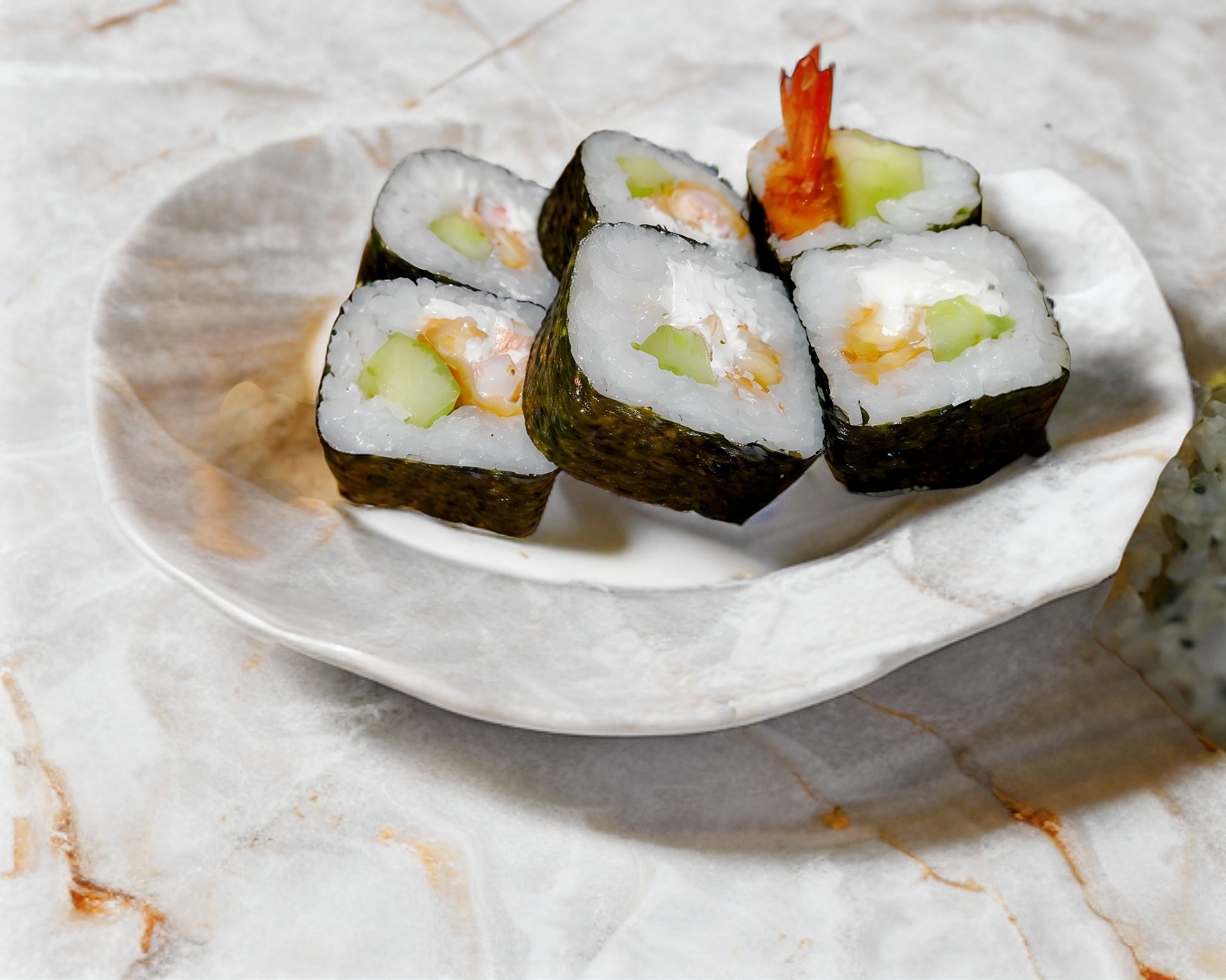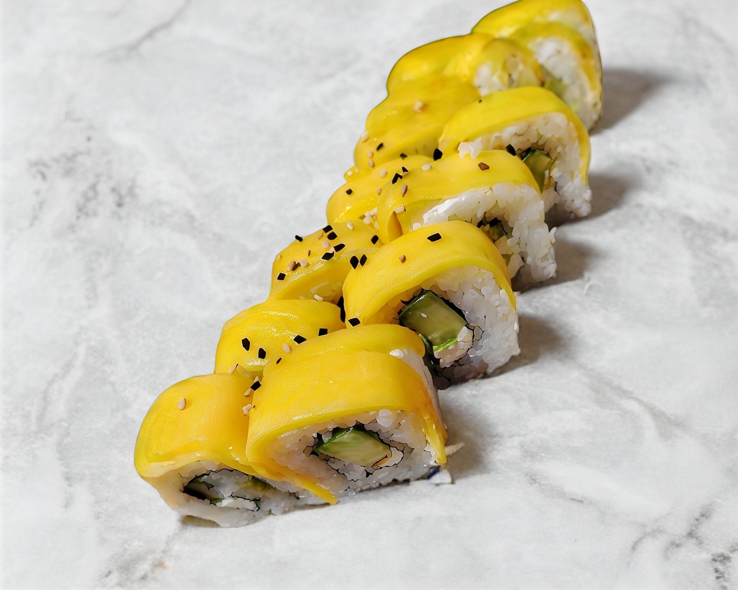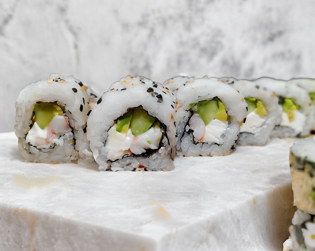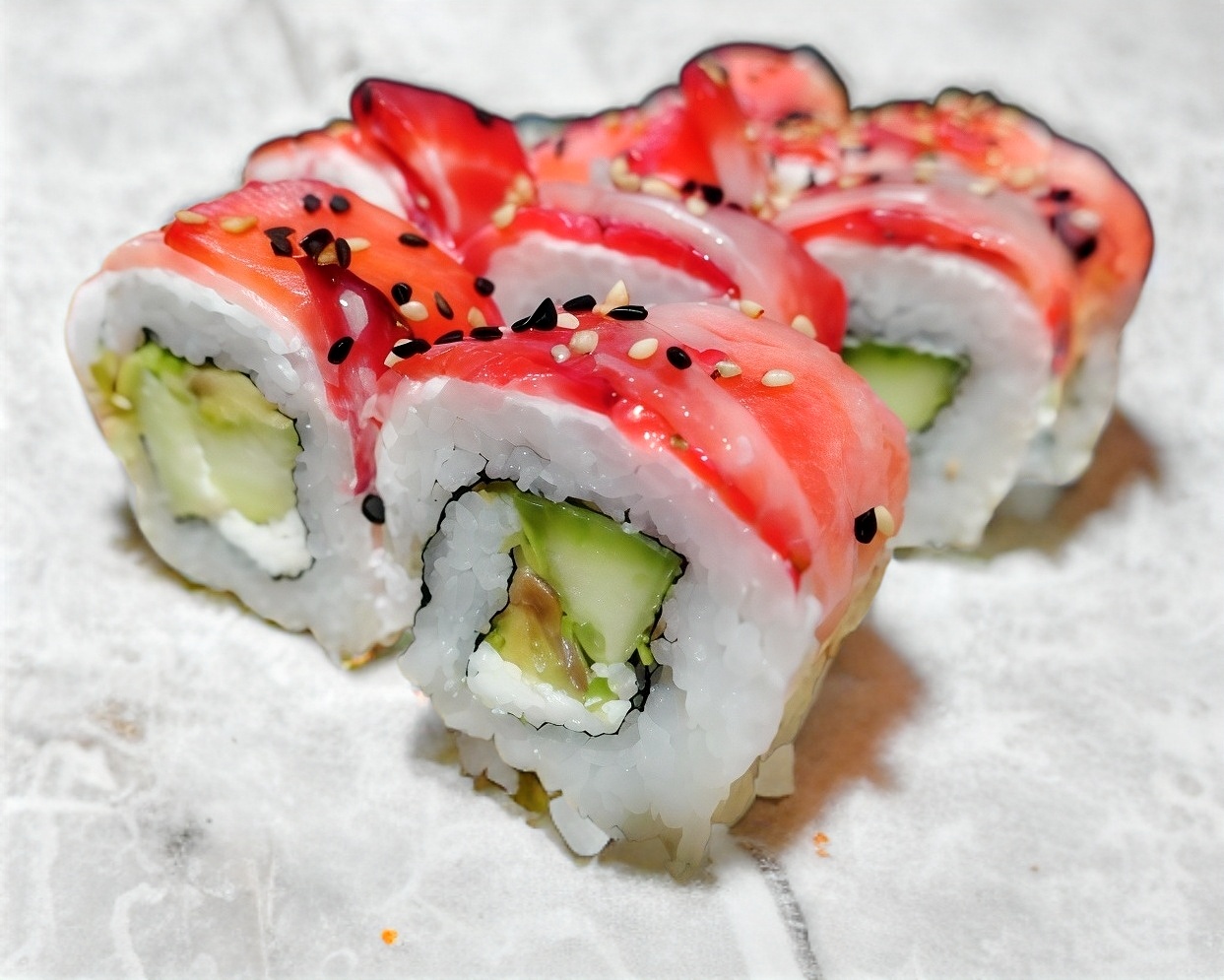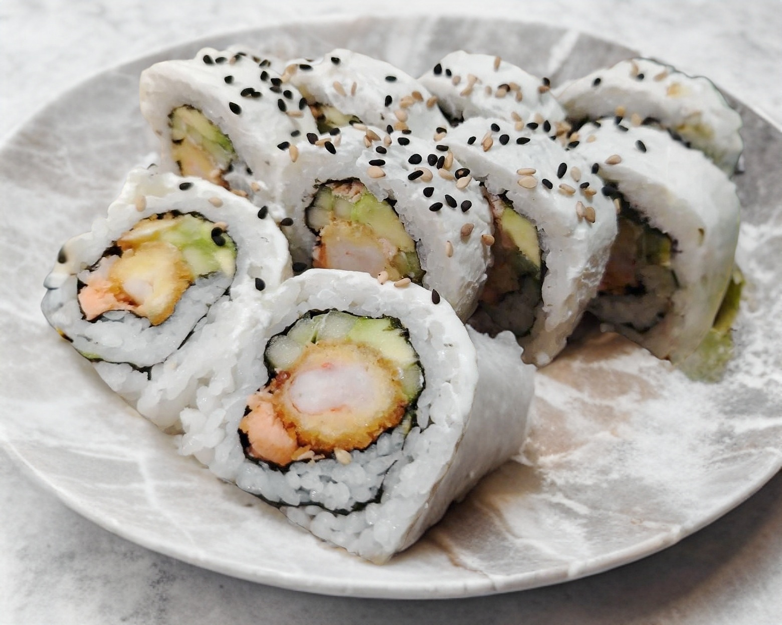PD:camarón sushi, aguacate, pepino y queso PF:ajonjoli tostado