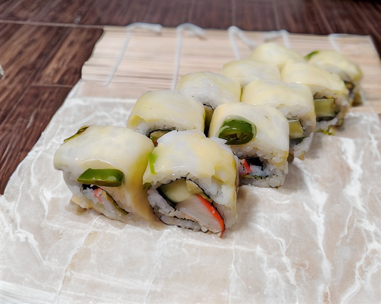 PD: Surimi fresco, pepino y aguacate PF: queso manchego gratinado con un toque de chiles toreados