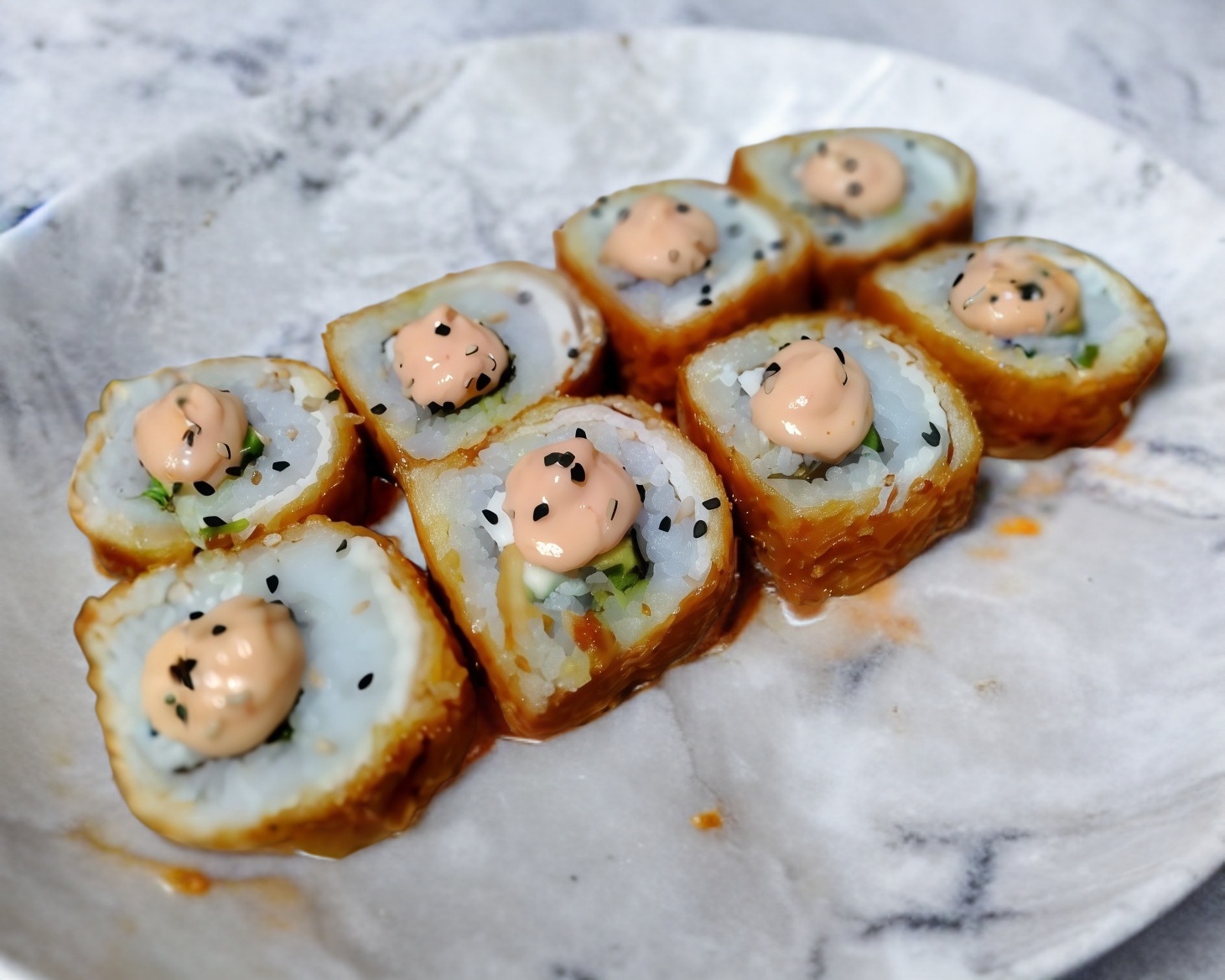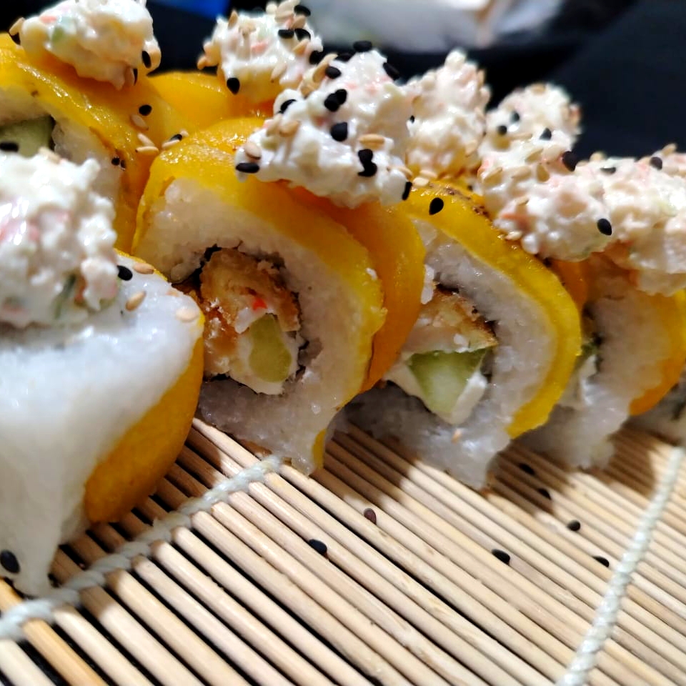 XD: camarón empanizado, salmón frito, aguacate y pepino PF: queso y ajonjolí con salsa de anguila
