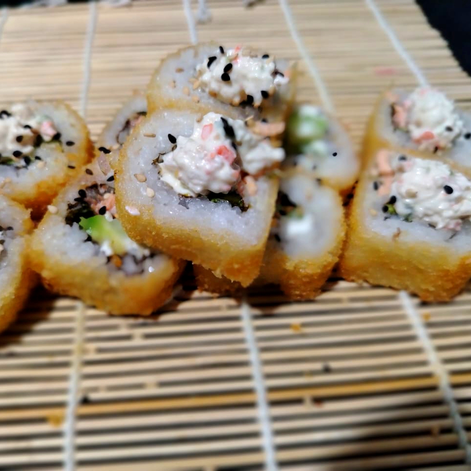 PD:queso, aguacate, pepino y surimi PF: frito con pasta temperatura, Tampico y salsa de Anguila