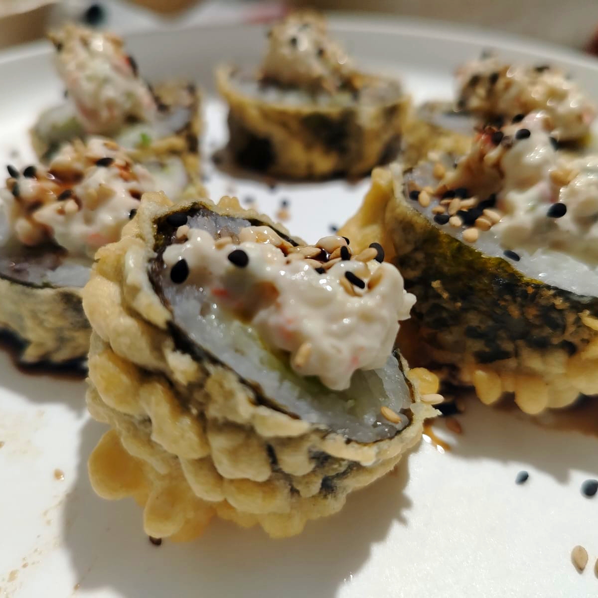 PD:camarón tempura, queso y pepino PF:aguacate y ajonjoli