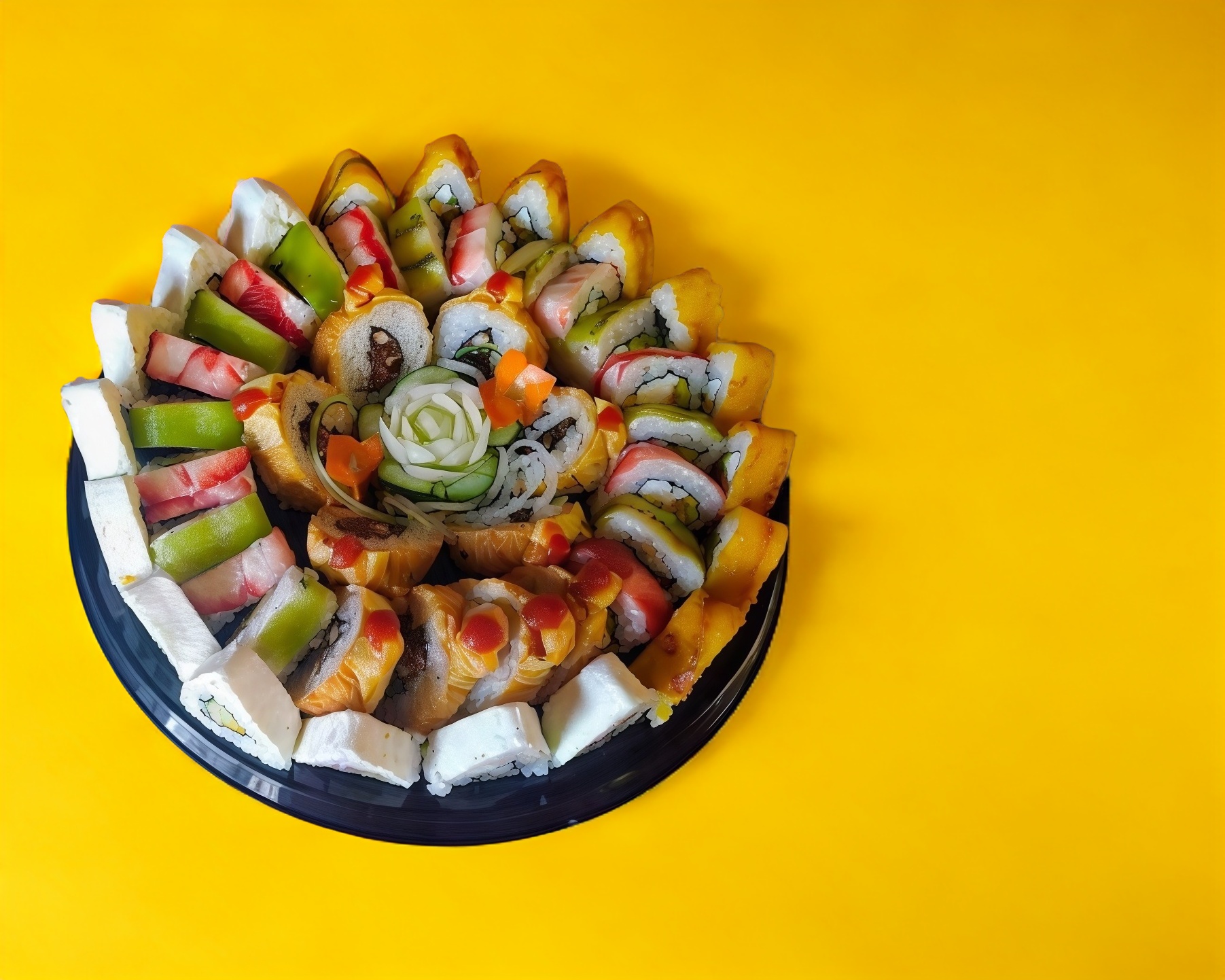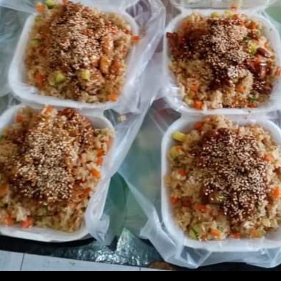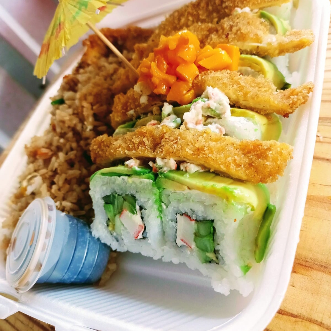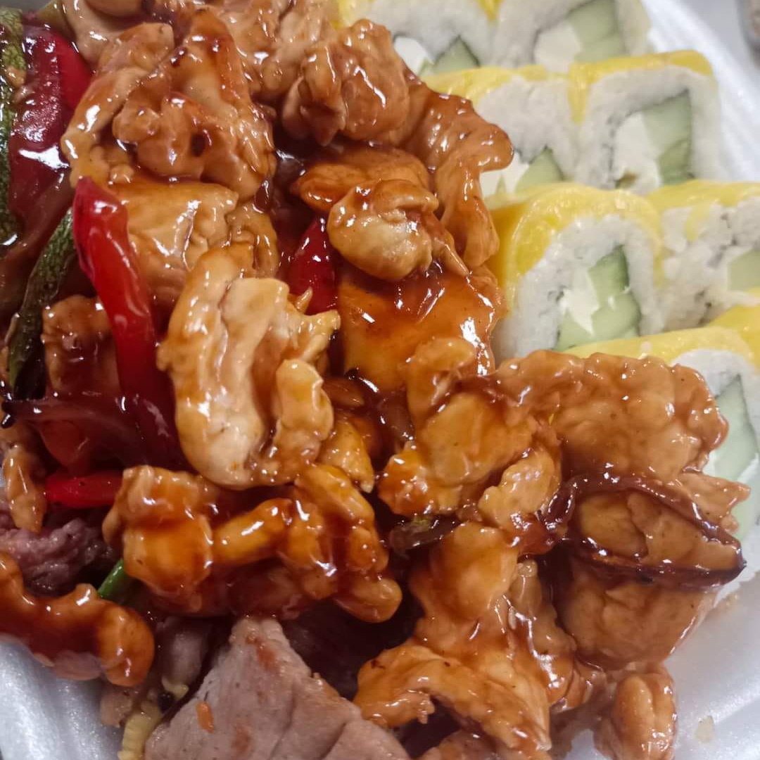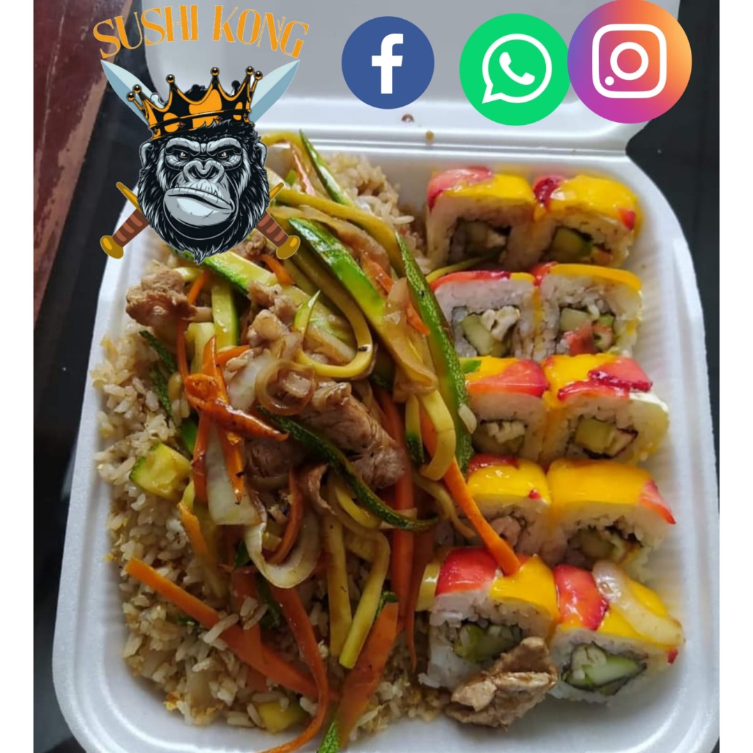 Rollos de 10 pz a elegir, porción individual de yakimeshi, carne teriyaki de res y pollo agridulce estilo japonés