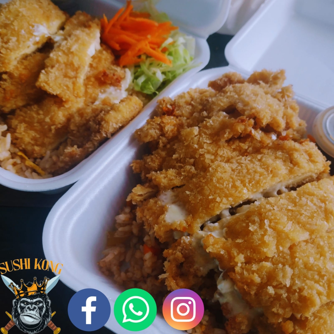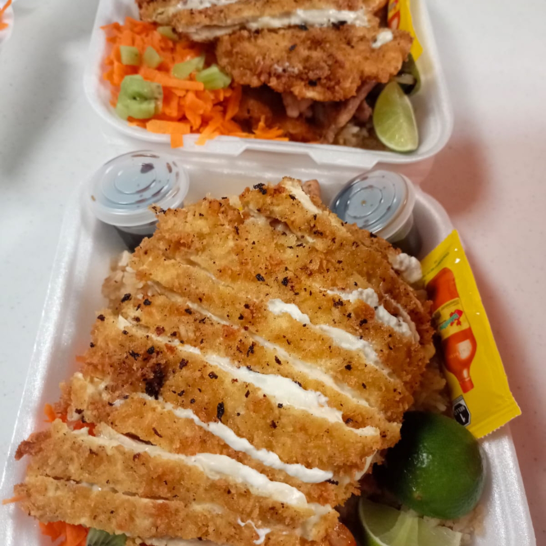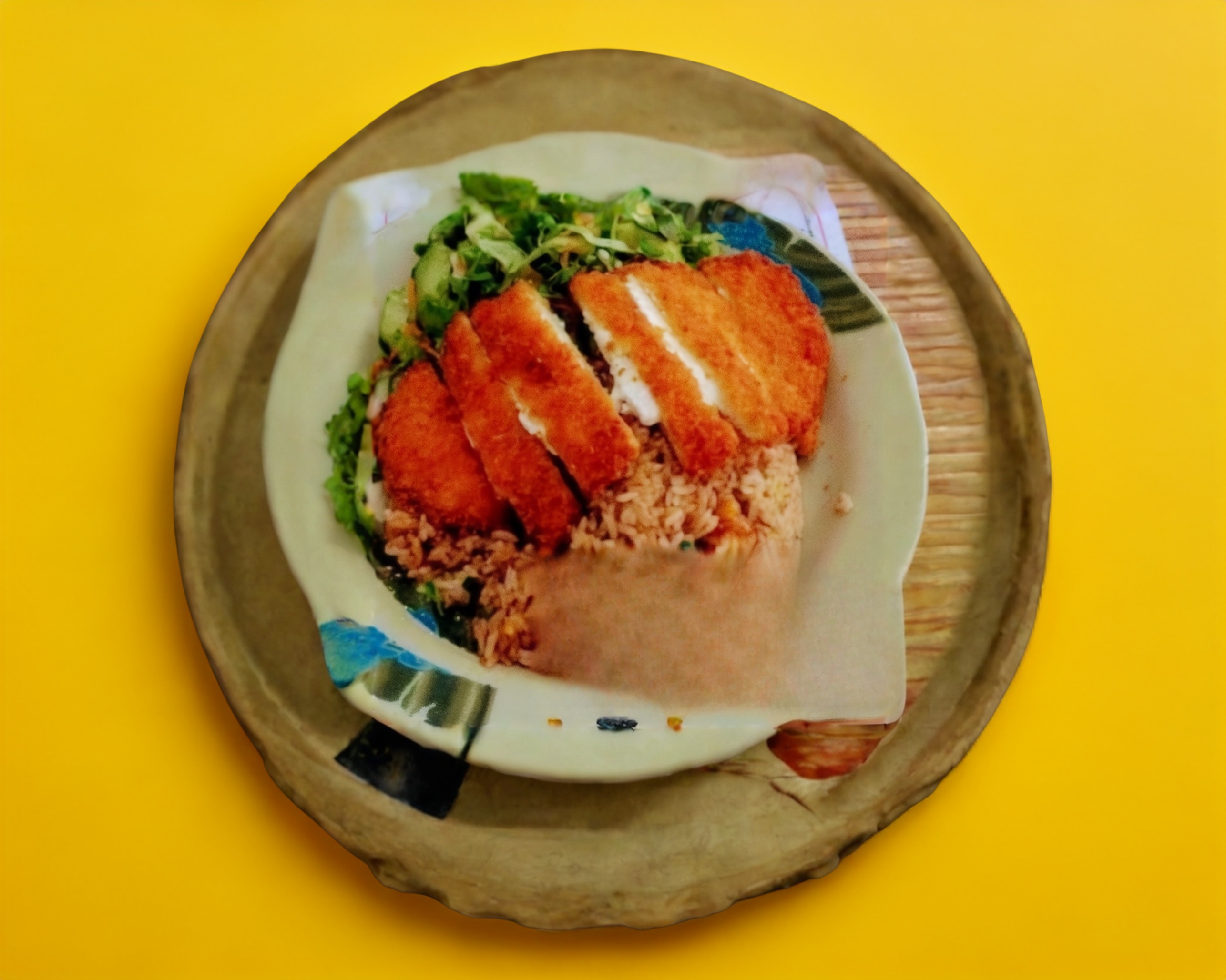 Pechuga de pollo rellena de queso manchego y queso crema, empanizada con Panko, acompañada de una porción (individual) de yakimeshi y ensalada de lechuga con zanahoria
