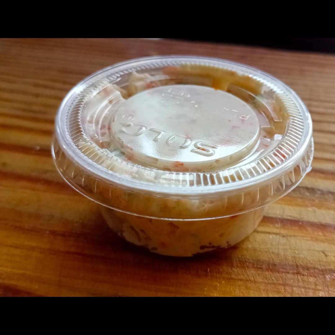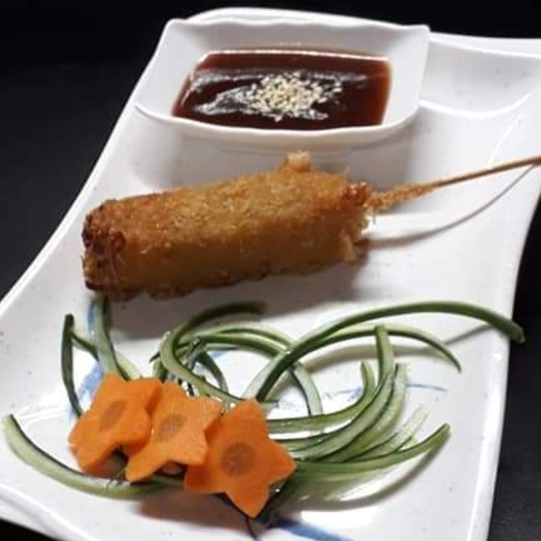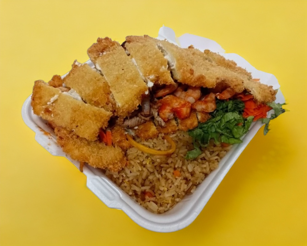 Pechuga de pollo rellena de queso manchego y queso crema, empanizada con Panko, acompañada de una porción (individual) de yakimeshi y ensalada de lechuga con zanahoria